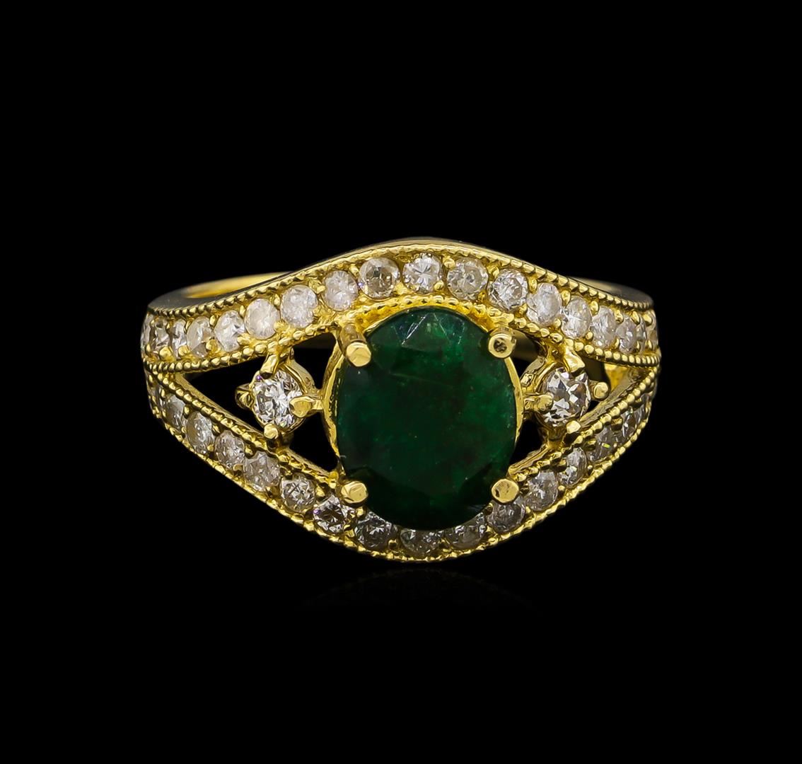 One electronically tested 14KT yellow gold ladies cast emerald and diamond ring. Condition is new, good workmanship. The featured emerald is accented by a single diamond on either side supported by mirroring diamond ribbons, completed by a three millimeter wide band. Bright polish finish with milgrain detailing throughout. Identified with markings of "K14". Containing: One prong set oval mixed cut natural emerald, measuring 8.95 x 7.00 x 4.35mm, 8% bulge factor, approximate weight of 1.63ct, clarity is heavily included, type III, medium dark, moderately strong, very slightly bluish green color, (GIA vslbG 6/4), cut is good. Transmitting light somewhat diffusely, transparent to translucent. Naturally occurring internal & external characteristics are present. Indications of oil residue. Graded in the setting. Two prong set old European & round brilliant cut diamonds, measuring 2.50 x 2.40 x 1.47mm (depth est.) approximate total weight of 2 Stones = 0.16ct. Graded in the setting. Clarity SI-2 Color H - I Thirty-Eight bead set round brilliant cut diamonds, measuring 1.70 - 1.60 x 0.99mm (depth est.) approximate total weight of 38 Stones = 0.72ct. Graded in the setting. Clarity I-1 to I-3 Color H - J Total Weight of Colored Stones 1.63ct. Total Weight of Diamonds 0.88ct. Total Weight of Ring 5.91 grams. AIG Appraised at $3,830.00.