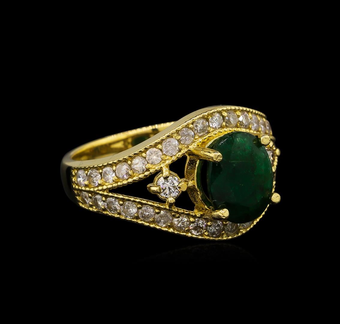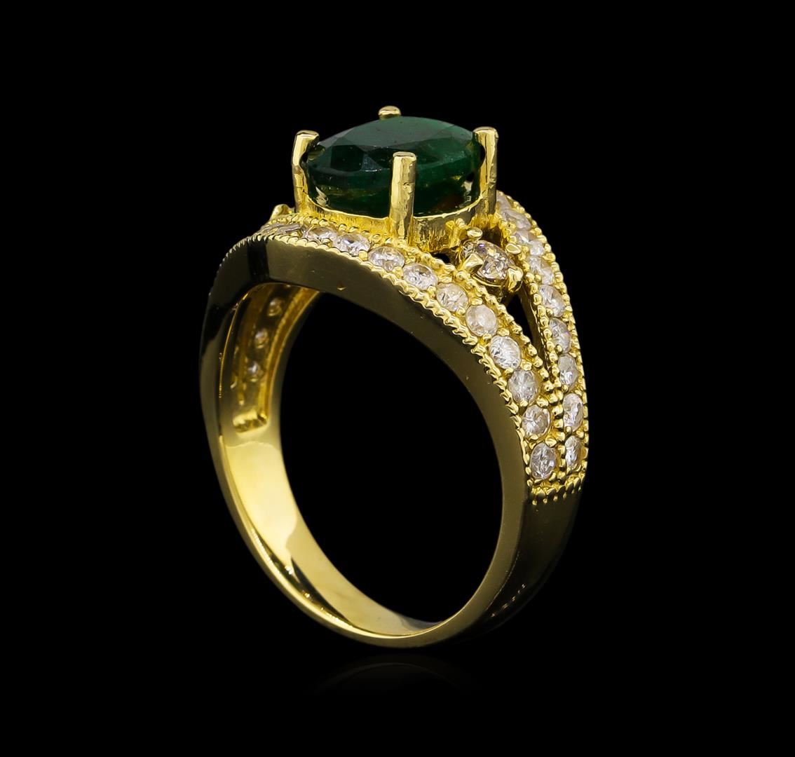 One electronically tested 14KT yellow gold ladies cast emerald and diamond ring. Condition is new, good workmanship. The featured emerald is accented by a single diamond on either side supported by mirroring diamond ribbons, completed by a three millimeter wide band. Bright polish finish with milgrain detailing throughout. Identified with markings of "K14". Containing: One prong set oval mixed cut natural emerald, measuring 8.95 x 7.00 x 4.35mm, 8% bulge factor, approximate weight of 1.63ct, clarity is heavily included, type III, medium dark, moderately strong, very slightly bluish green color, (GIA vslbG 6/4), cut is good. Transmitting light somewhat diffusely, transparent to translucent. Naturally occurring internal & external characteristics are present. Indications of oil residue. Graded in the setting. Two prong set old European & round brilliant cut diamonds, measuring 2.50 x 2.40 x 1.47mm (depth est.) approximate total weight of 2 Stones = 0.16ct. Graded in the setting. Clarity SI-2 Color H - I Thirty-Eight bead set round brilliant cut diamonds, measuring 1.70 - 1.60 x 0.99mm (depth est.) approximate total weight of 38 Stones = 0.72ct. Graded in the setting. Clarity I-1 to I-3 Color H - J Total Weight of Colored Stones 1.63ct. Total Weight of Diamonds 0.88ct. Total Weight of Ring 5.91 grams. AIG Appraised at $3,830.00.