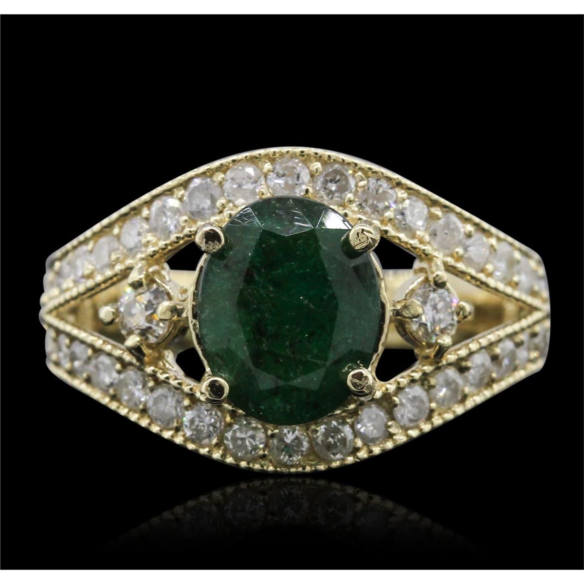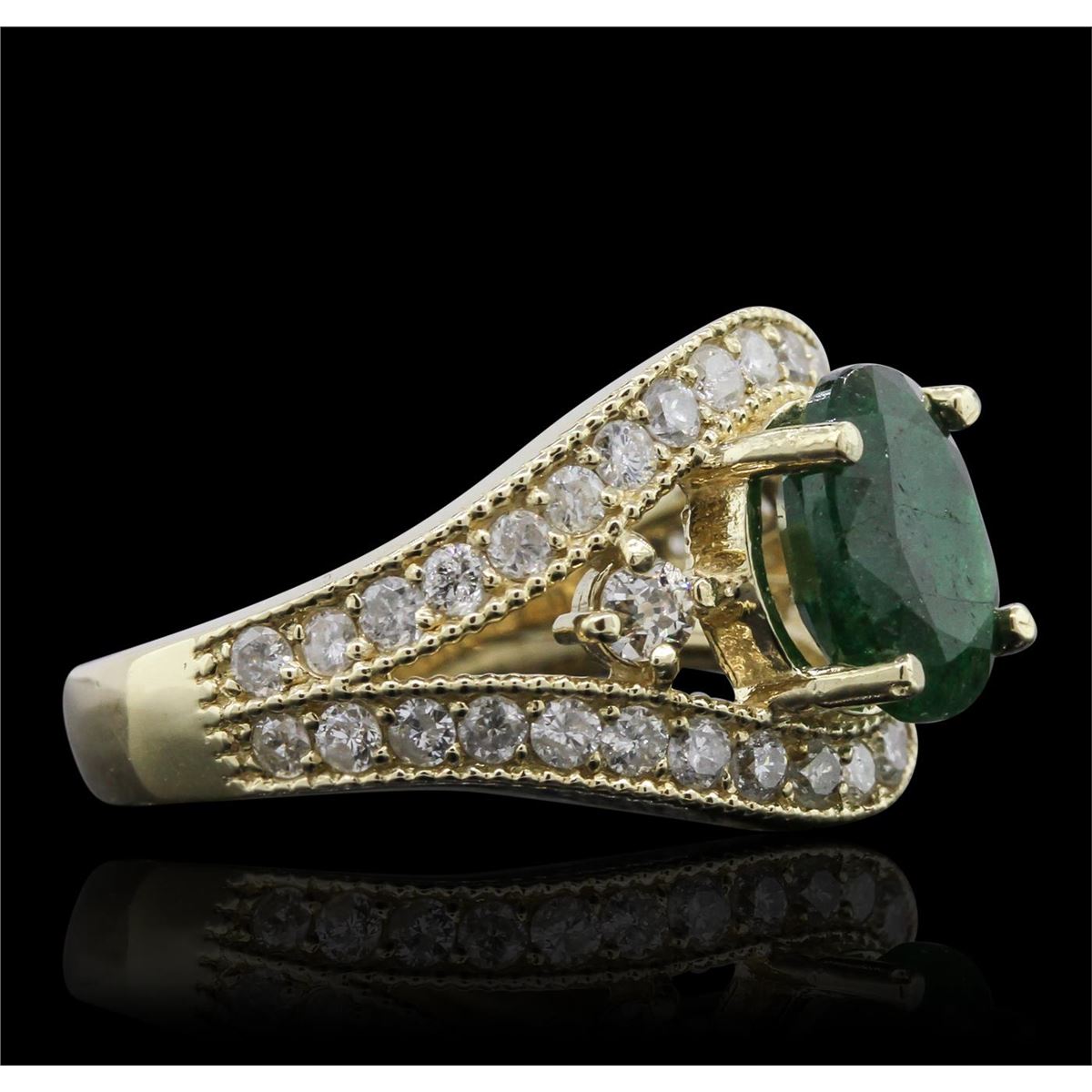 One electronically tested 14KT yellow gold ladies cast emerald and diamond ring. Condition is new, good workmanship. The featured emerald is accented by a single diamond on either side supported by mirroring diamond ribbons, completed by a three millimeter wide band. Bright polish finish with milgrain detailing throughout. Identified with markings of "K14". Containing: One prong set oval mixed cut natural emerald, measuring 8.95 x 7.00 x 4.35mm, 8% bulge factor, approximate weight of 1.63ct, clarity is heavily included, type III, medium dark, moderately strong, very slightly bluish green color, (GIA vslbG 6/4), cut is good. Transmitting light somewhat diffusely, transparent to translucent. Naturally occurring internal & external characteristics are present. Indications of oil residue. Graded in the setting. Two prong set old European & round brilliant cut diamonds, measuring 2.50 x 2.40 x 1.47mm (depth est.) approximate total weight of 2 Stones = 0.16ct. Graded in the setting. Clarity SI-2 Color H - I Thirty-Eight bead set round brilliant cut diamonds, measuring 1.70 - 1.60 x 0.99mm (depth est.) approximate total weight of 38 Stones = 0.72ct. Graded in the setting. Clarity I-1 to I-3 Color H - J Total Weight of Colored Stones 1.63ct. Total Weight of Diamonds 0.88ct. Total Weight of Ring 5.91 grams. AIG Appraised at $3,830.00.