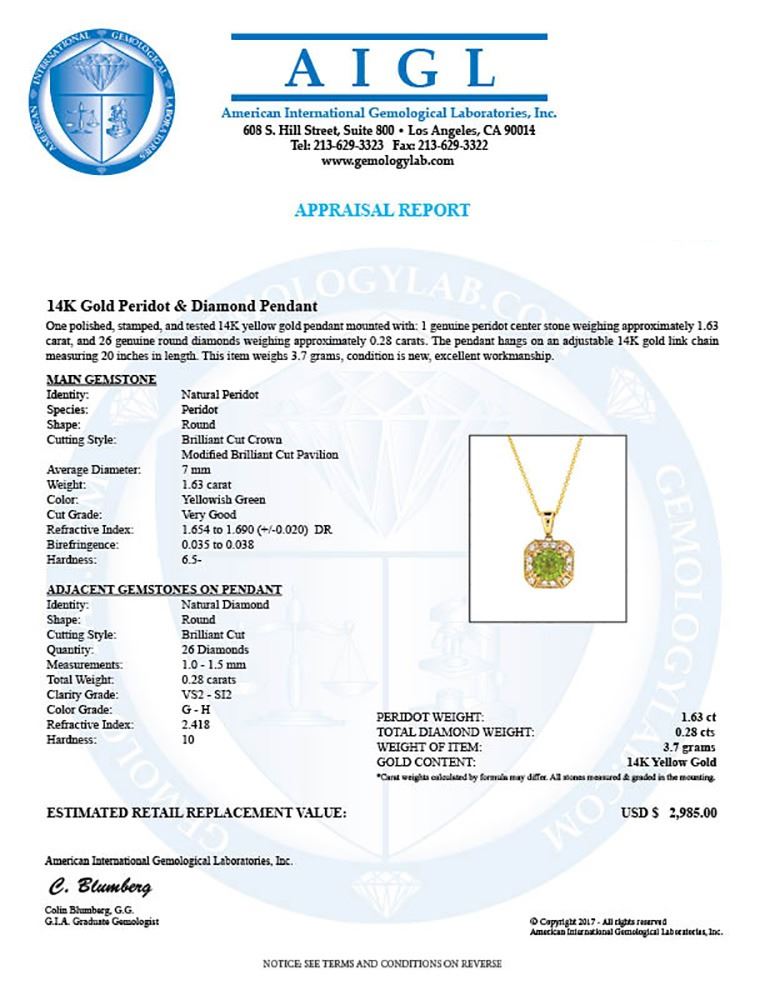 14KT Yellow Gold 1.63ct Peridot and Diamond Pendant with Chain