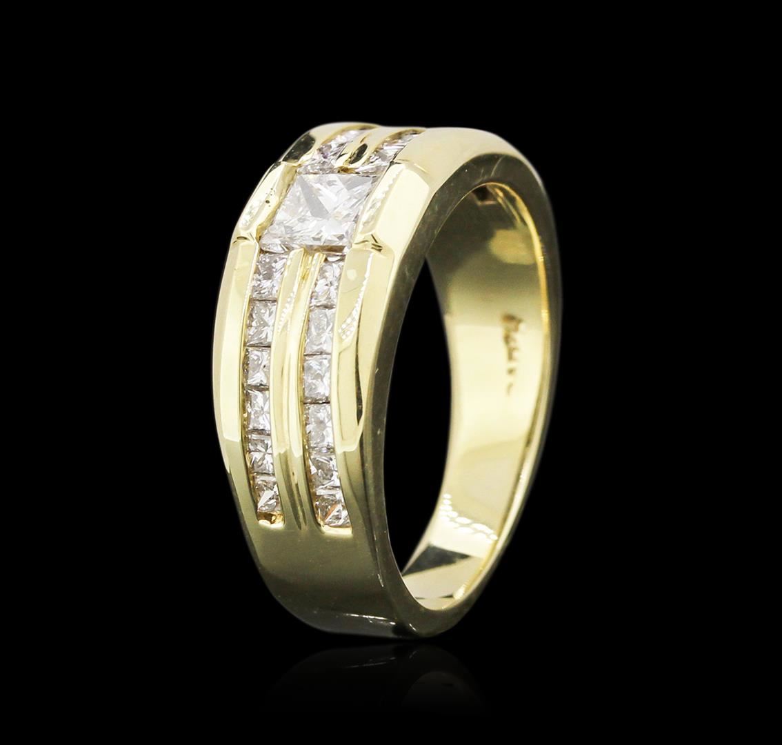 One electronically tested 14KT yellow gold ladies cast diamond engagement ring with a bright polish finish. Identified with markings of "14K". Condition is very good. Containing: One prong set princess cut diamond, measuring 4.20 x 4.20 x 3.15mm (depth est.) approximate weight of 0.46ct. Clarity: SI-2. Color: J. Twenty-Four channel set princess cut diamonds, measuring 2.00 x 2.00 x 1.50mm (depth est.) approximate total weight of 24 Stones = 1.18ct. Clarity: SI-1 to SI-2. Color: J. All diamonds are graded in the mounting, unless otherwise stated. Total Weight of Diamonds 1.64ct. Total Weight of Engagement Ring 6.00 grams. GGL Appraised at $3,600.00.