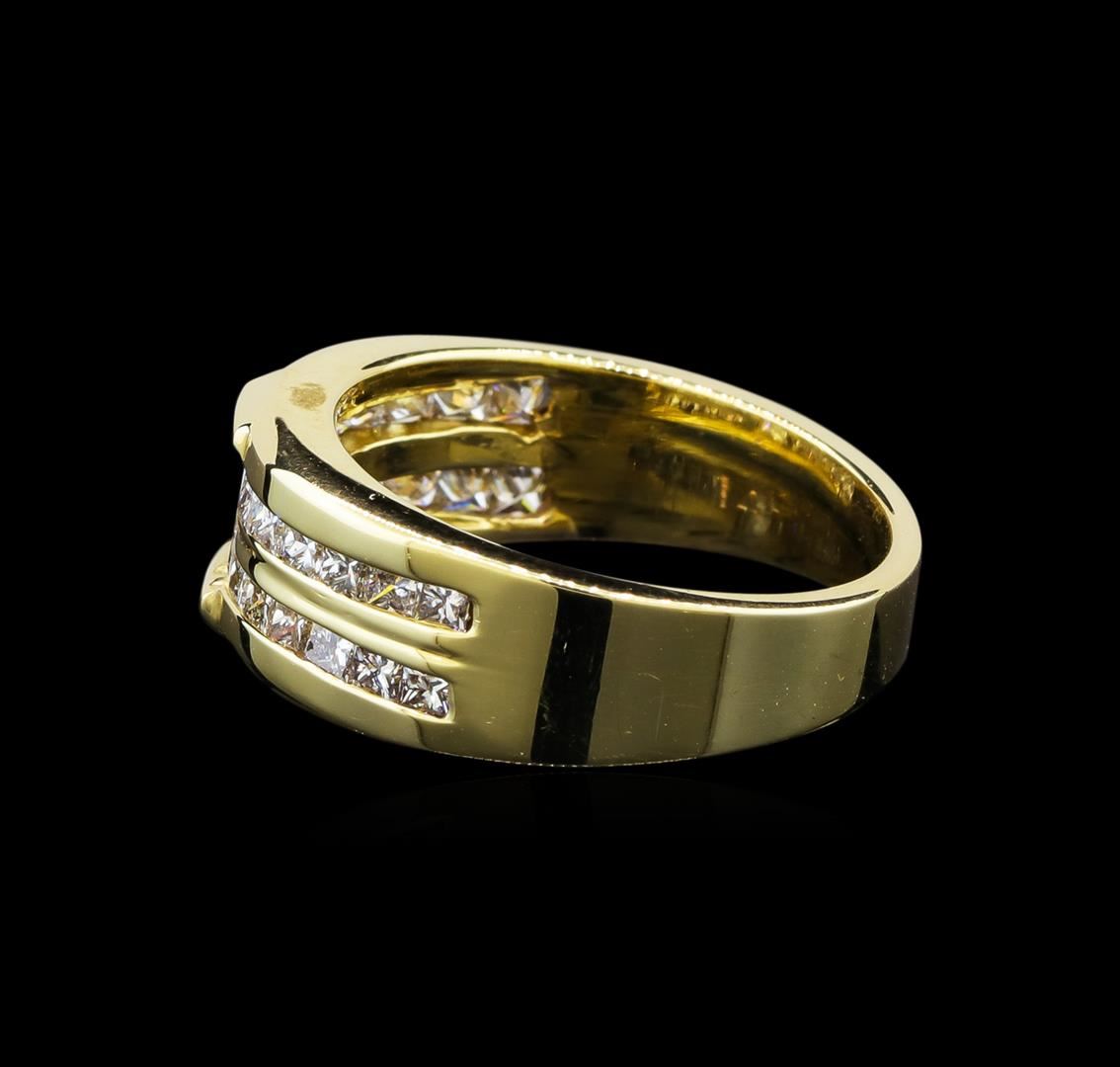 One electronically tested 14KT yellow gold ladies cast diamond engagement ring with a bright polish finish. Identified with markings of "14K". Condition is very good. Containing: One prong set princess cut diamond, measuring 4.20 x 4.20 x 3.15mm (depth est.) approximate weight of 0.46ct. Clarity: SI-2. Color: J. Twenty-Four channel set princess cut diamonds, measuring 2.00 x 2.00 x 1.50mm (depth est.) approximate total weight of 24 Stones = 1.18ct. Clarity: SI-1 to SI-2. Color: J. All diamonds are graded in the mounting, unless otherwise stated. Total Weight of Diamonds 1.64ct. Total Weight of Engagement Ring 6.00 grams. GGL Appraised at $3,600.00.