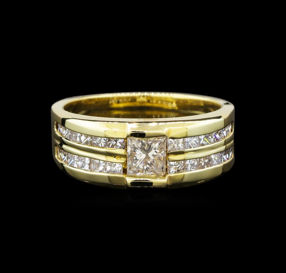 One electronically tested 14KT yellow gold ladies cast diamond engagement ring with a bright polish finish. Identified with markings of "14K". Condition is very good. Containing: One prong set princess cut diamond, measuring 4.20 x 4.20 x 3.15mm (depth est.) approximate weight of 0.46ct. Clarity: SI-2. Color: J. Twenty-Four channel set princess cut diamonds, measuring 2.00 x 2.00 x 1.50mm (depth est.) approximate total weight of 24 Stones = 1.18ct. Clarity: SI-1 to SI-2. Color: J. All diamonds are graded in the mounting, unless otherwise stated. Total Weight of Diamonds 1.64ct. Total Weight of Engagement Ring 6.00 grams. GGL Appraised at $3,600.00.