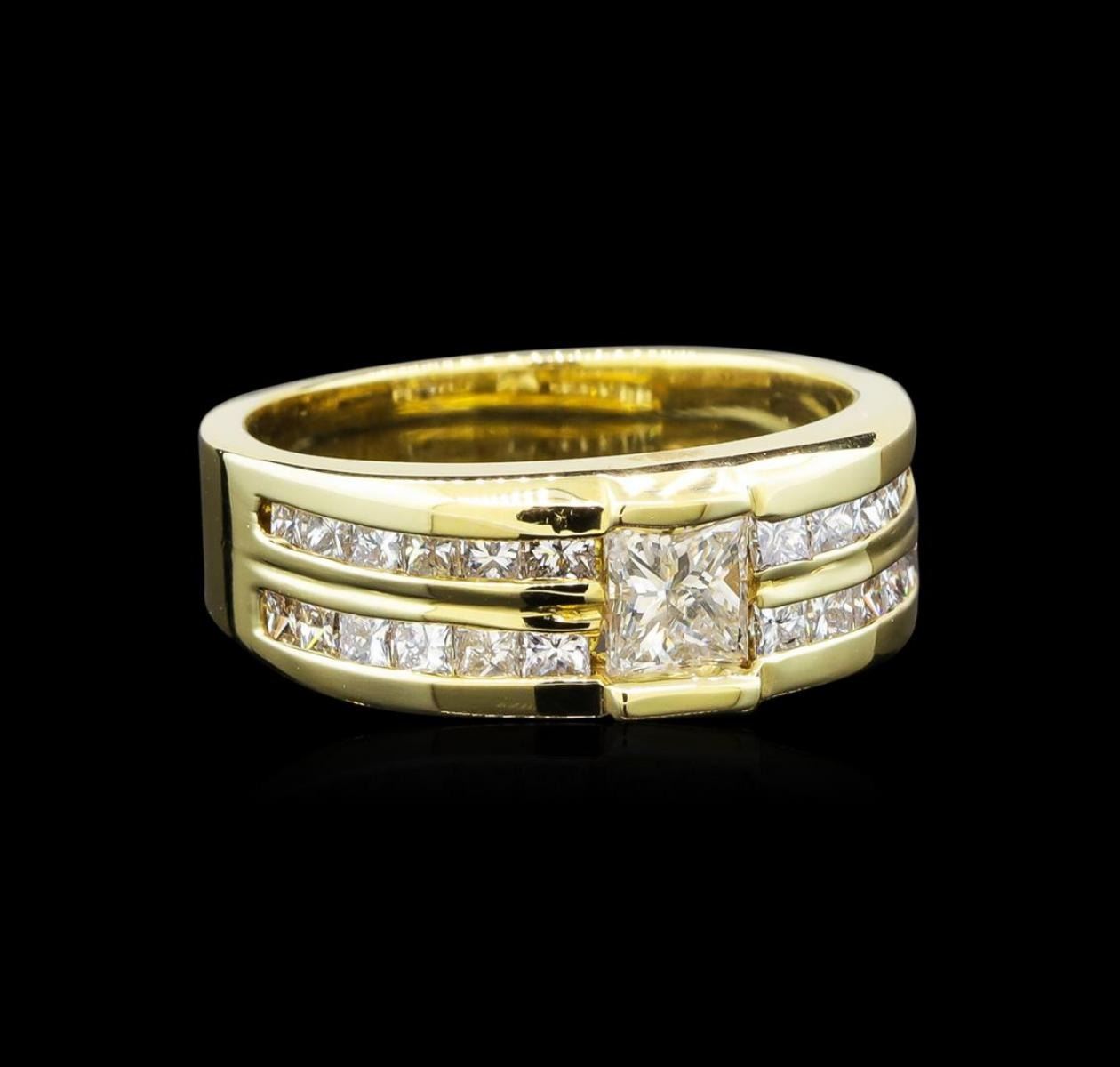 One electronically tested 14KT yellow gold ladies cast diamond engagement ring with a bright polish finish. Identified with markings of "14K". Condition is very good. Containing: One prong set princess cut diamond, measuring 4.20 x 4.20 x 3.15mm (depth est.) approximate weight of 0.46ct. Clarity: SI-2. Color: J. Twenty-Four channel set princess cut diamonds, measuring 2.00 x 2.00 x 1.50mm (depth est.) approximate total weight of 24 Stones = 1.18ct. Clarity: SI-1 to SI-2. Color: J. All diamonds are graded in the mounting, unless otherwise stated. Total Weight of Diamonds 1.64ct. Total Weight of Engagement Ring 6.00 grams. GGL Appraised.
