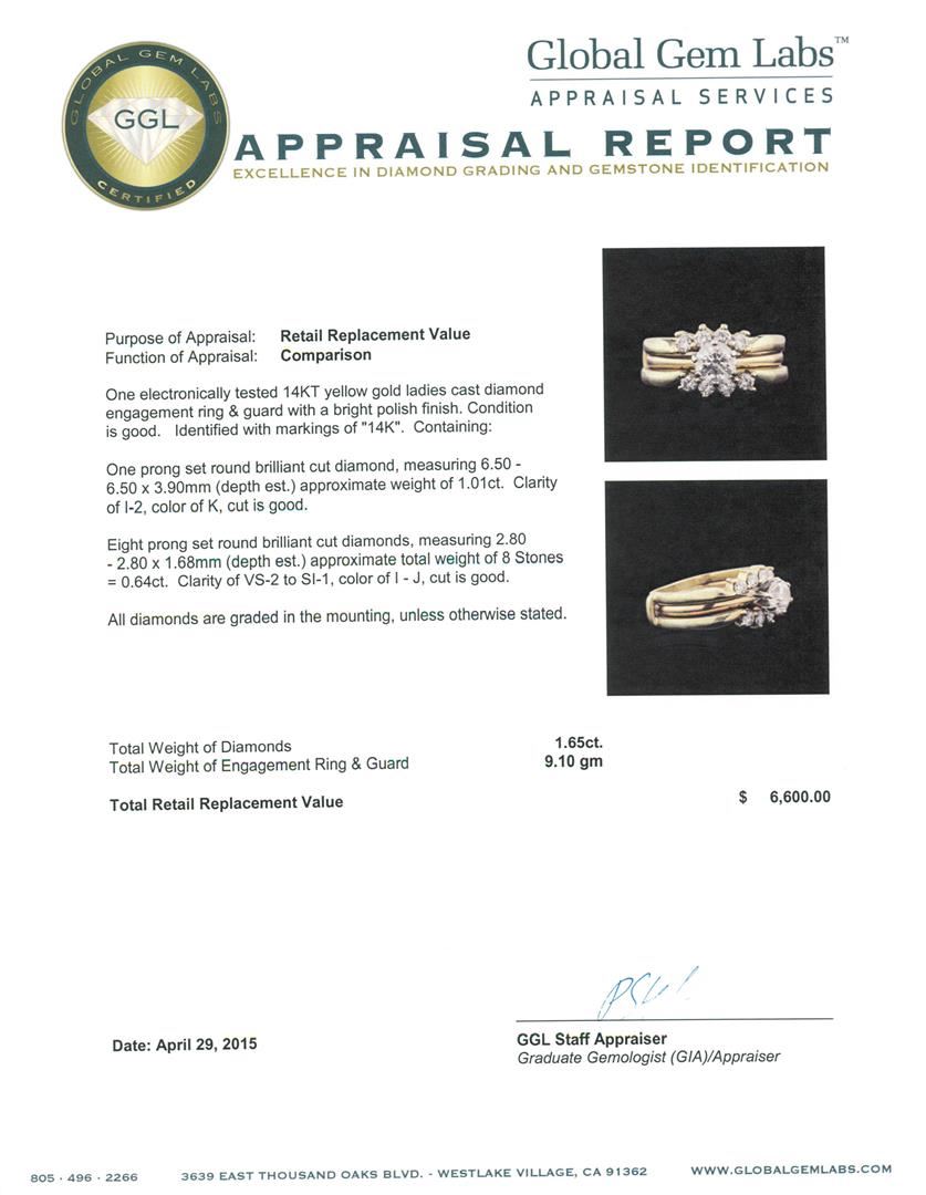 One electronically tested 14KT yellow gold ladies cast diamond engagement ring & guard with a bright polish finish. Identified with markings of "14K". Condition is good. Containing: One prong set round brilliant cut diamond, measuring 6.50 - 6.50 x 3.90mm (depth est.) approximate weight of 1.01ct. Clarity: I-2. Color: K, Cut is Good. Eight prong set round brilliant cut diamonds, measuring 2.80 - 2.80 x 1.68mm (depth est.) approximate total weight of 8 Stones = 0.64ct. Clarity: VS-2 to SI-1. Color: I - J, Cut is Good. All diamonds are graded in the mounting, unless otherwise stated. Total Weight of Diamonds 1.65ct. Total Weight of Engagement Ring & Guard 9.10 grams. GGL Appraised at $6,600.00.