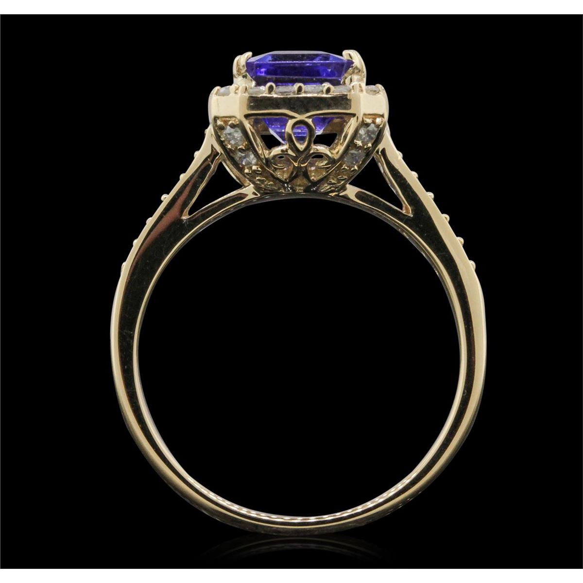One electronically tested 14KT yellow gold ladies combination cast & assembled tanzanite and diamond ring with a flat shank with a bright polish finish. Identified with markings of "14K". Condition is new. Containing: One prong set emerald standard step cut natural tanzanite, measuring 9.29 x 6.31 x 3.19mm, approximate weight of 1.69ct., clarity is eye clean, type I, medium light, very slightly grayish, violet color, (GIA V 4/3), cut is good. Thirty-Three prong set round brilliant cut diamonds, measuring 1.30 - 1.30 x 0.78mm (depth est.) approximate total weight of 33 Stones = 0.26ct. Clarity: I-1 to I-2. Color: J - K, Cut is Good. Colored gemstones are presumed to have been subjected to commonly used enhancement processes. All diamonds and colored gemstones are graded in the mounting, unless otherwise stated. Total Weight of Colored Stones 1.69ct. Total Weight of Diamonds 0.26ct. Total Weight of Ring 4.20 grams. GGL Appraised at $4,170.00.
