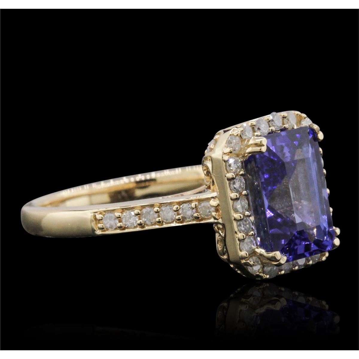 One electronically tested 14KT yellow gold ladies combination cast & assembled tanzanite and diamond ring with a flat shank with a bright polish finish. Identified with markings of "14K". Condition is new. Containing: One prong set emerald standard step cut natural tanzanite, measuring 9.29 x 6.31 x 3.19mm, approximate weight of 1.69ct., clarity is eye clean, type I, medium light, very slightly grayish, violet color, (GIA V 4/3), cut is good. Thirty-Three prong set round brilliant cut diamonds, measuring 1.30 - 1.30 x 0.78mm (depth est.) approximate total weight of 33 Stones = 0.26ct. Clarity: I-1 to I-2. Color: J - K, Cut is Good. Colored gemstones are presumed to have been subjected to commonly used enhancement processes. All diamonds and colored gemstones are graded in the mounting, unless otherwise stated. Total Weight of Colored Stones 1.69ct. Total Weight of Diamonds 0.26ct. Total Weight of Ring 4.20 grams. GGL Appraised at $4,170.00.