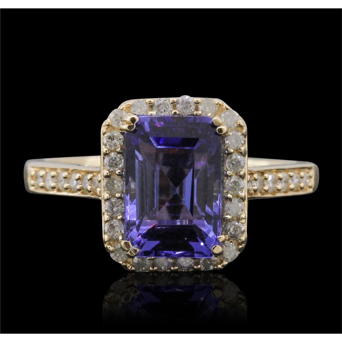 One electronically tested 14KT yellow gold ladies combination cast & assembled tanzanite and diamond ring with a flat shank with a bright polish finish. Identified with markings of "14K". Condition is new. Containing: One prong set emerald standard step cut natural tanzanite, measuring 9.29 x 6.31 x 3.19mm, approximate weight of 1.69ct., clarity is eye clean, type I, medium light, very slightly grayish, violet color, (GIA V 4/3), cut is good. Thirty-Three prong set round brilliant cut diamonds, measuring 1.30 - 1.30 x 0.78mm (depth est.) approximate total weight of 33 Stones = 0.26ct. Clarity: I-1 to I-2. Color: J - K, Cut is Good. Colored gemstones are presumed to have been subjected to commonly used enhancement processes. All diamonds and colored gemstones are graded in the mounting, unless otherwise stated. Total Weight of Colored Stones 1.69ct. Total Weight of Diamonds 0.26ct. Total Weight of Ring 4.20 grams. GGL Appraised at $4,170.00.