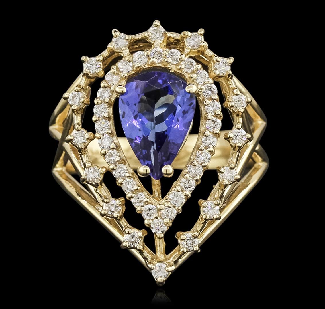 One electronically tested 14KT yellow gold ladies combination cast & assembled tanzanite and diamond ring with a split shank with a bright polish finish. Identified with markings of "K14". Condition is new. Containing: One prong set pear modified brilliant cut natural tanzanite, measuring 9.89 x 6.78 x 3.77mm, approximate weight of 1.69ct., clarity is eye clean, type I, medium, moderately strong, bluish violet color, (GIA bV 5/4), cut is good. Forty-One prong set round brilliant cut diamonds, measuring 1.50 - 1.30 x 0.84mm (depth est.) approximate total weight of 41 Stones = 0.41ct. Clarity: I-1. Color: K - L, Cut is Good. Colored gemstones are presumed to have been subjected to commonly used enhancement processes. All diamonds and colored gemstones are graded in the mounting, unless otherwise stated. Total Weight of Colored Stones 1.69ct. Total Weight of Diamonds 0.41ct. Total Weight of Ring 6.90 grams. GGL Appraised at $5,245.00.