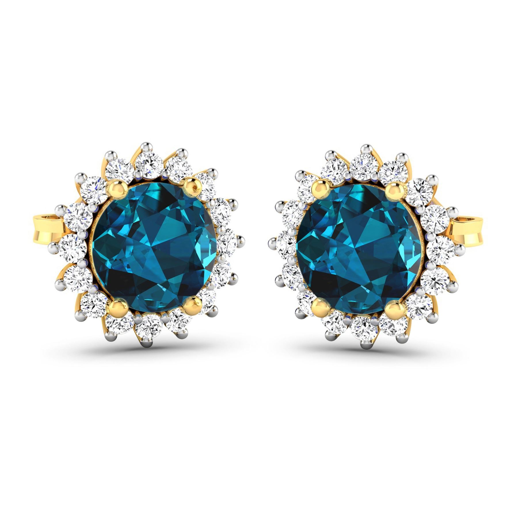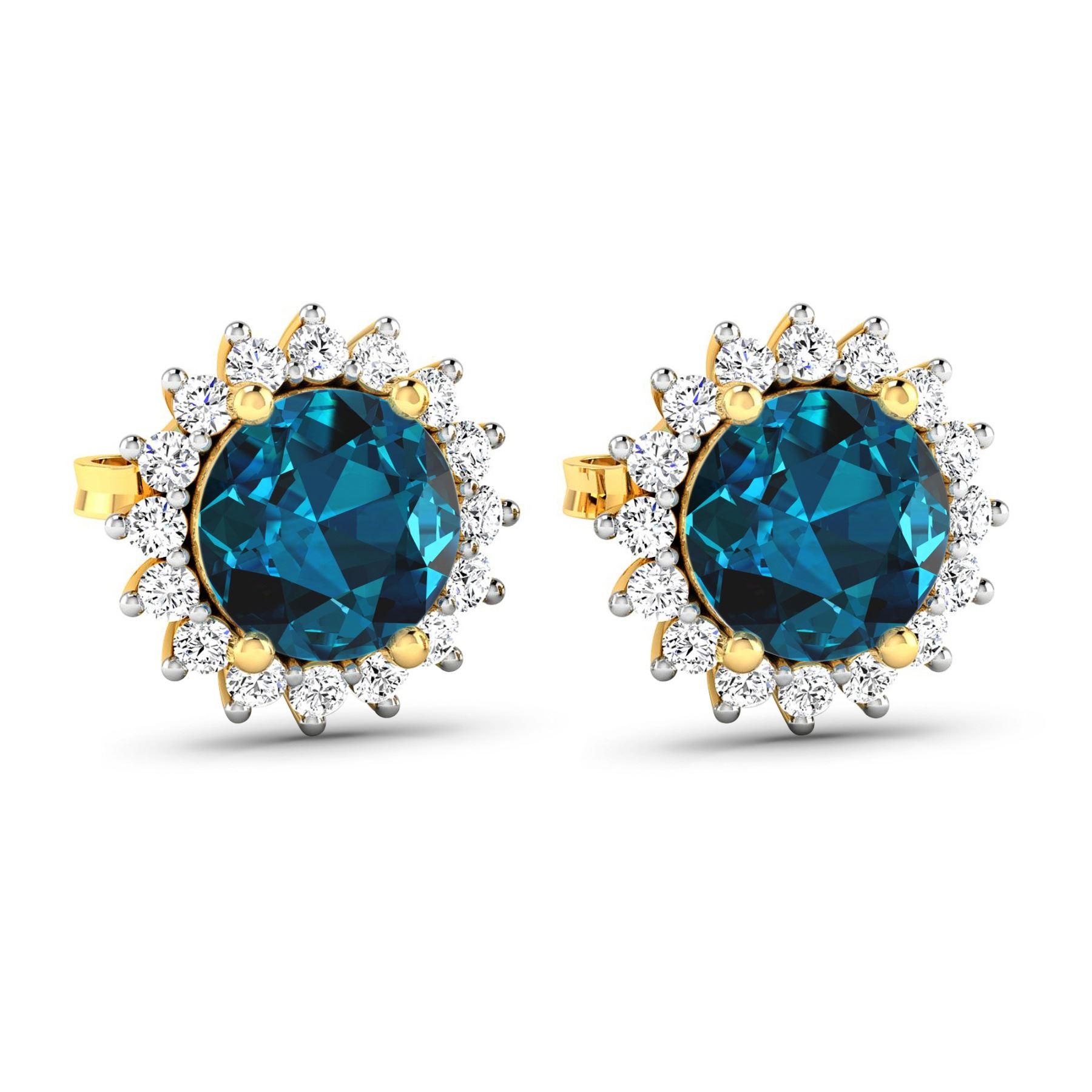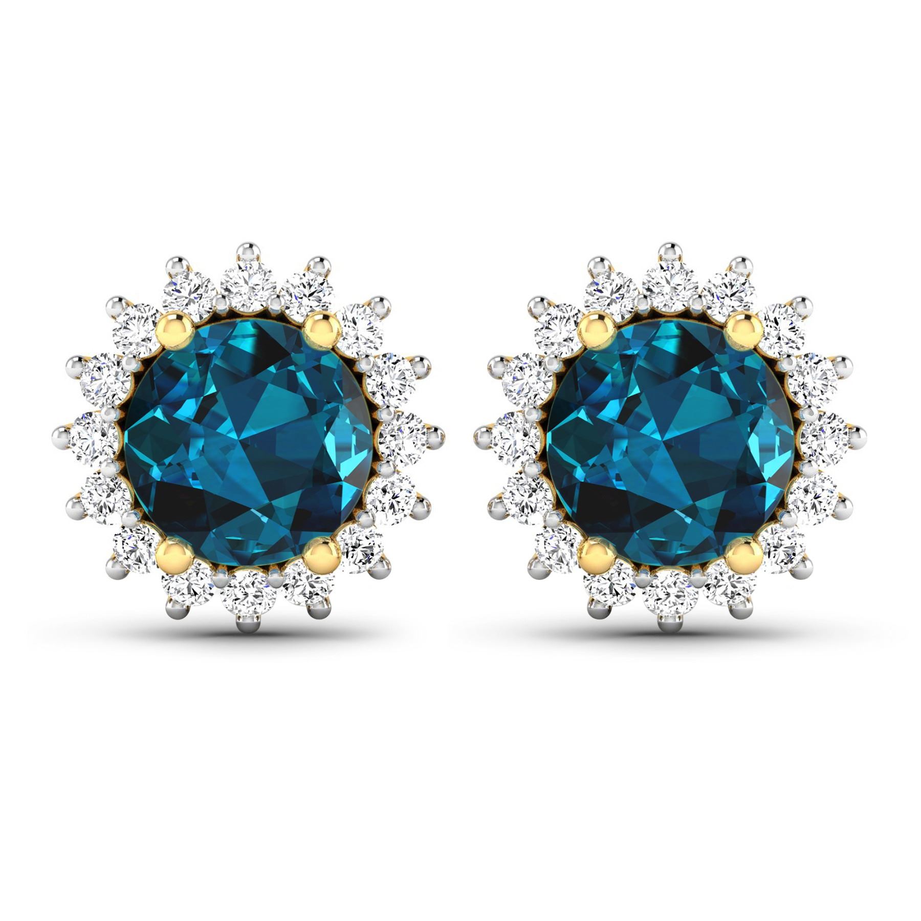 London Blue Topaz Round 6.00mm - 2Pcs + White Diamond F/C Round 1.30mm - 32Pcs ( Push-Post ) ( White Pan Rhodium ) (I1-I2/I color) Total weight of gemstones is 1.6cts. Total Diamond weight is 0.32cts. Total weight of these earrings are 2.19 grams.