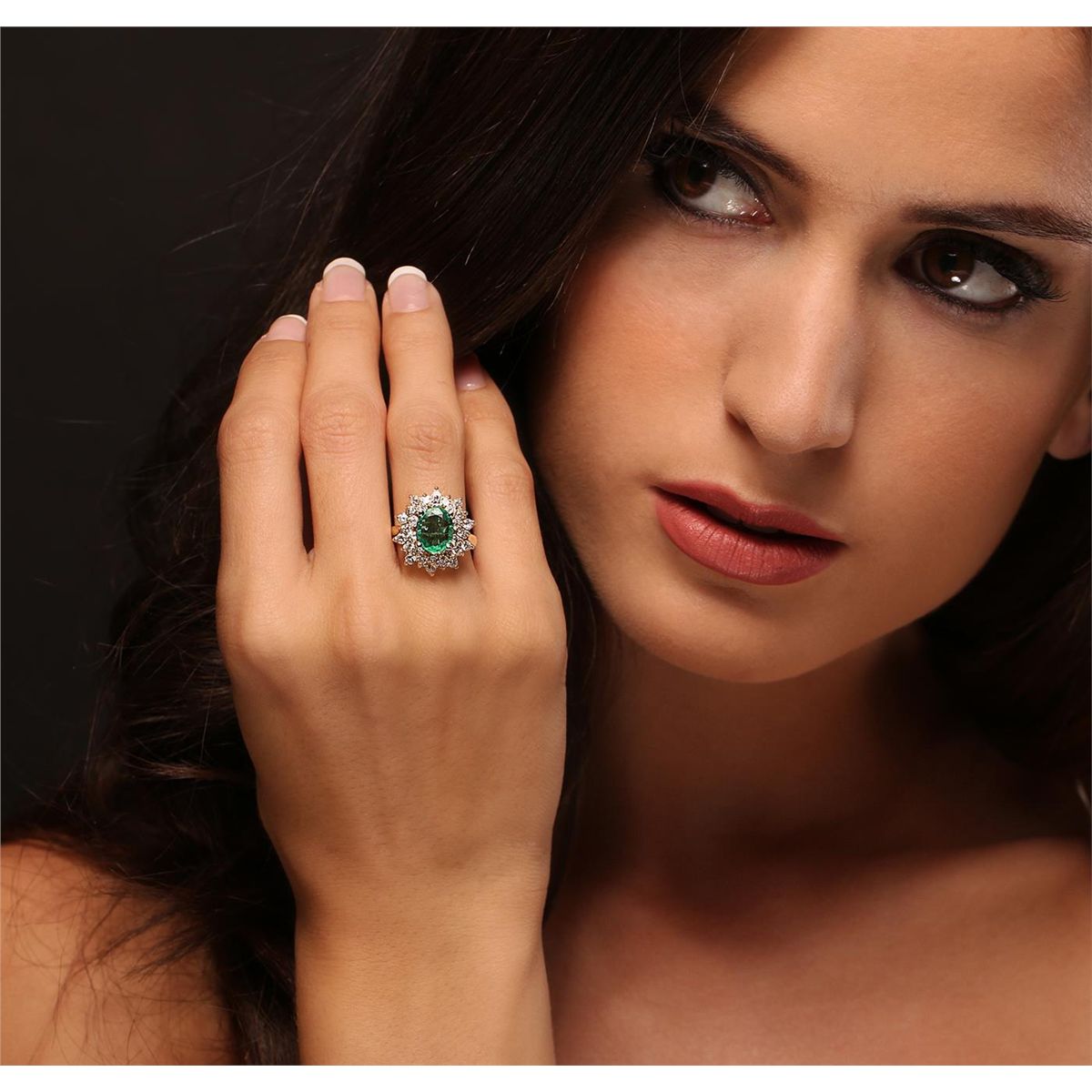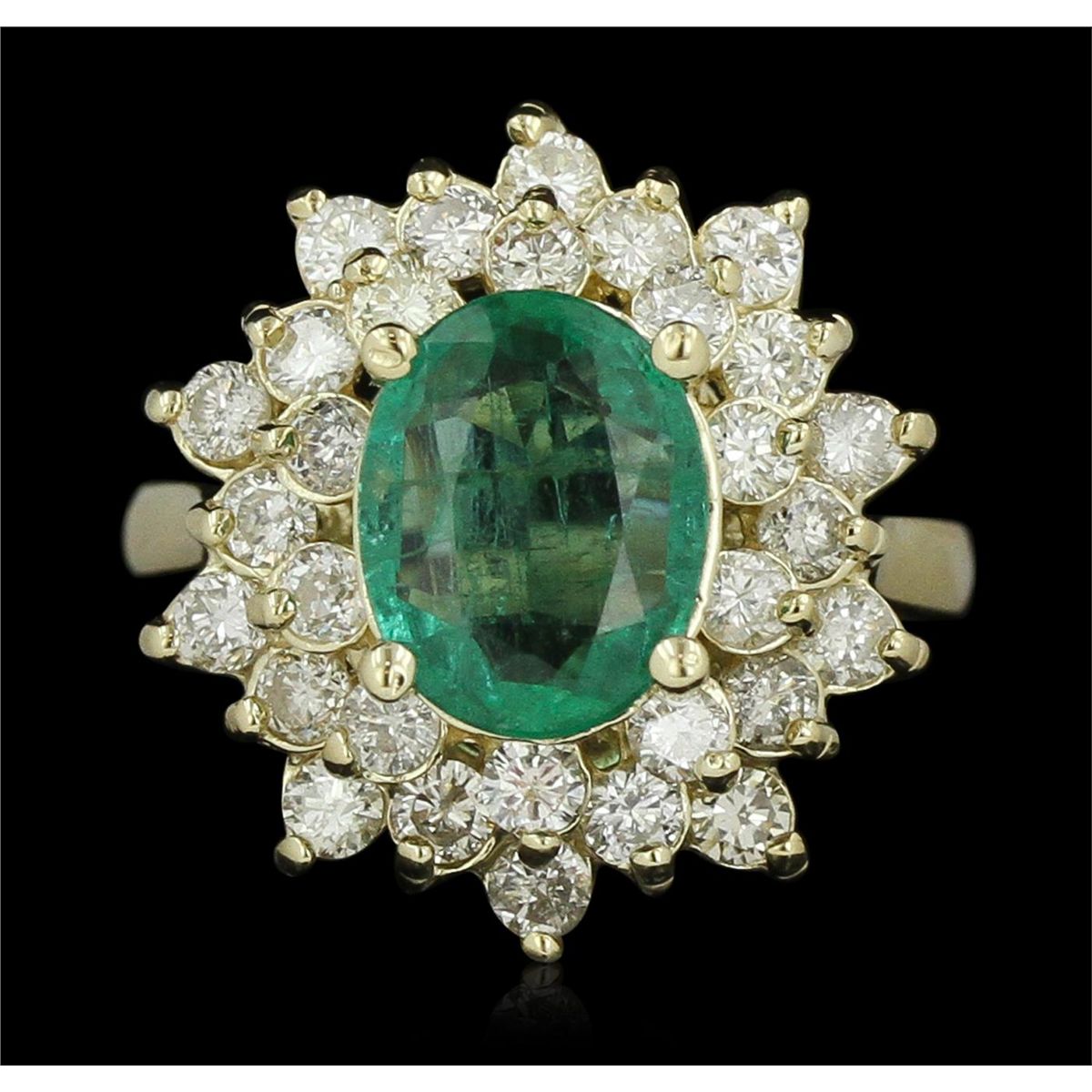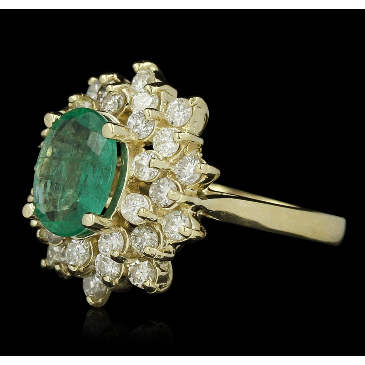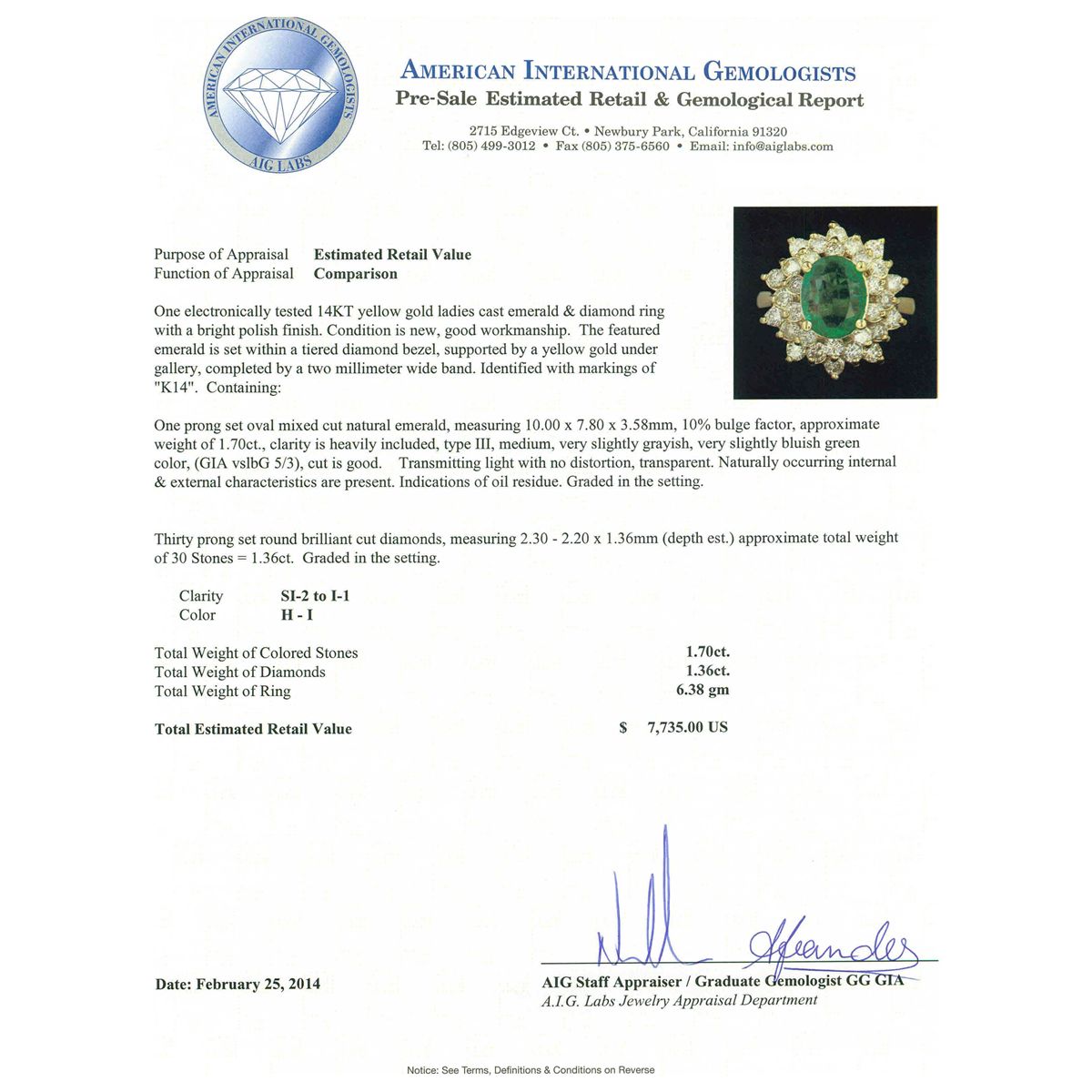 One electronically tested 14KT yellow gold ladies cast emerald & diamond ring with a bright polish finish. Condition is new, good workmanship. The featured emerald is set within a tiered diamond bezel, supported by a yellow gold under gallery, completed by a two millimeter wide band. Identified with markings of "K14". Containing: One prong set oval mixed cut natural emerald, measuring 10.00 x 7.80 x 3.58mm, 10% bulge factor, approximate weight of 1.70ct, clarity is heavily included, type III, medium, very slightly grayish, very slightly bluish green color, (GIA vslbG 5/3), cut is good. Transmitting light with no distortion, transparent. Naturally occurring internal & external characteristics are present. Indications of oil residue. Graded in the setting. Thirty prong set round brilliant cut diamonds, measuring 2.30 - 2.20 x 1.36mm (depth est.) approximate total weight of 30 Stones = 1.36ct. Graded in the setting. Clarity SI-2 to I-1 Color H - I Total Weight of Colored Stones 1.70ct. Total Weight of Diamonds 1.36ct. Total Weight of Ring 6.38 grams. AIG Appraised at $7,735.00.