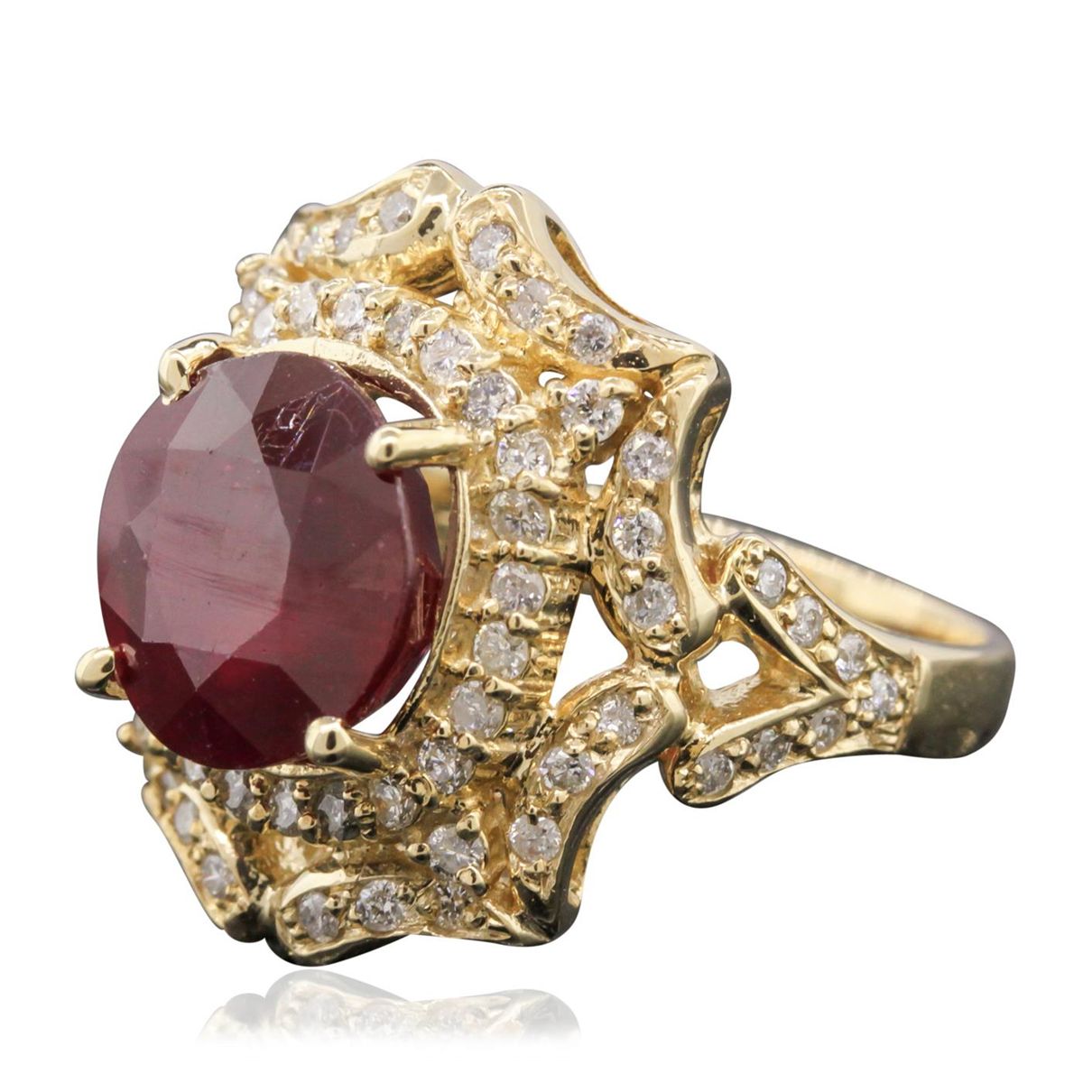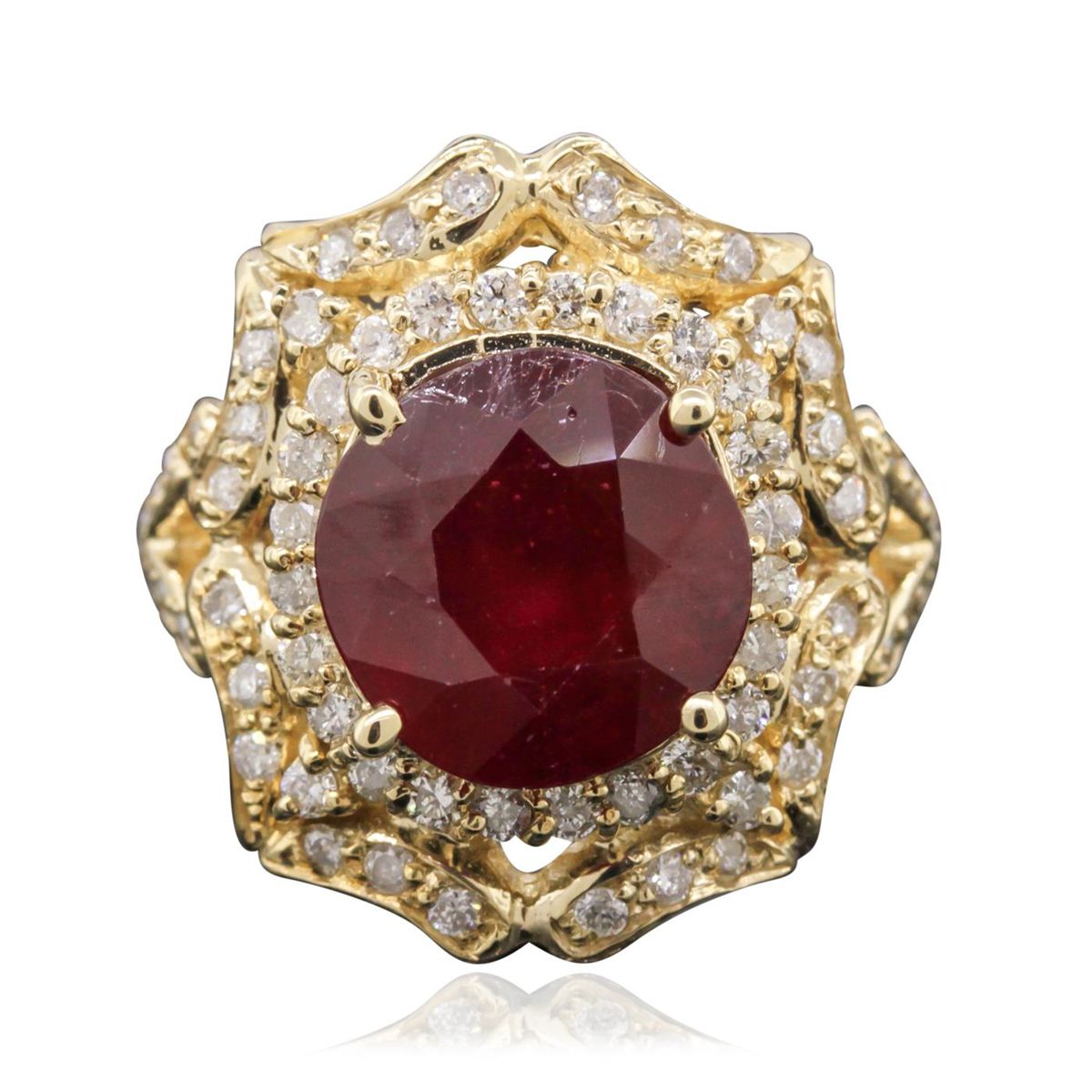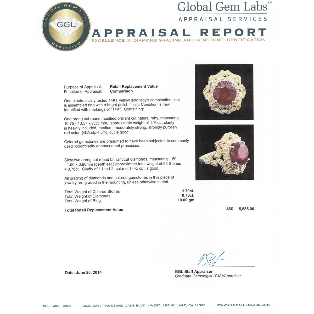 One electronically tested 14KT yellow gold Ladies combination cast & assembled ring with a bright polish finish. Condition is new. Identified with markings of "14K". Containing: One prong set round modified brilliant cut natural ruby, measuring 10.75 - 10.57 x 7.35 mm, approximate weight of 1.70ct., clarity is heavily included, medium, moderately strong, strongly purplish red color, (GIA stpR 5/4), cut is good. Colored gemstones are presumed to have been subjected to commonly used color/clarity enhancement processes. Sixty-Two prong set round brilliant cut diamonds, measuring 1.50 - 1.50 x 0.90mm (depth est.) approximate. Total Weight of 62 Stones = 0.76ct. Clarity: I-1 to I-2. Color: I - K, Cut is Good. All grading of diamonds and colored gemstones in this piece of jewelry are graded in the mounting, unless otherwise stated. Total Weight of Colored Stones 1.70ct. Total Weight of Diamonds 0.76ct. Total Weight of Ring 10.00 grams. GGL Appraised at $5,585.00.