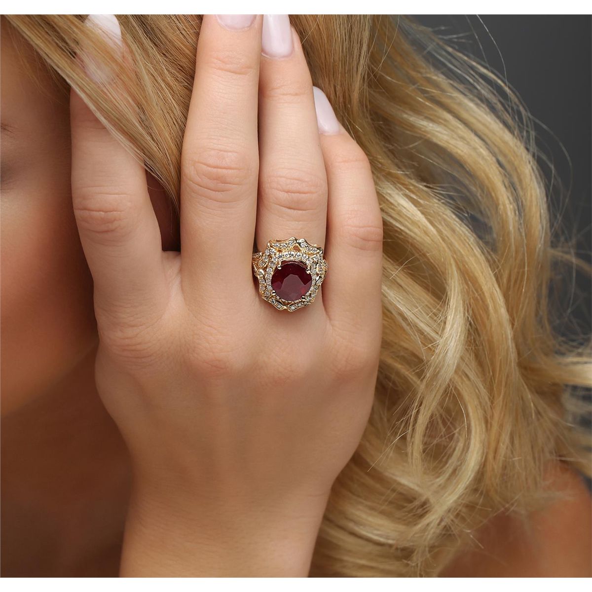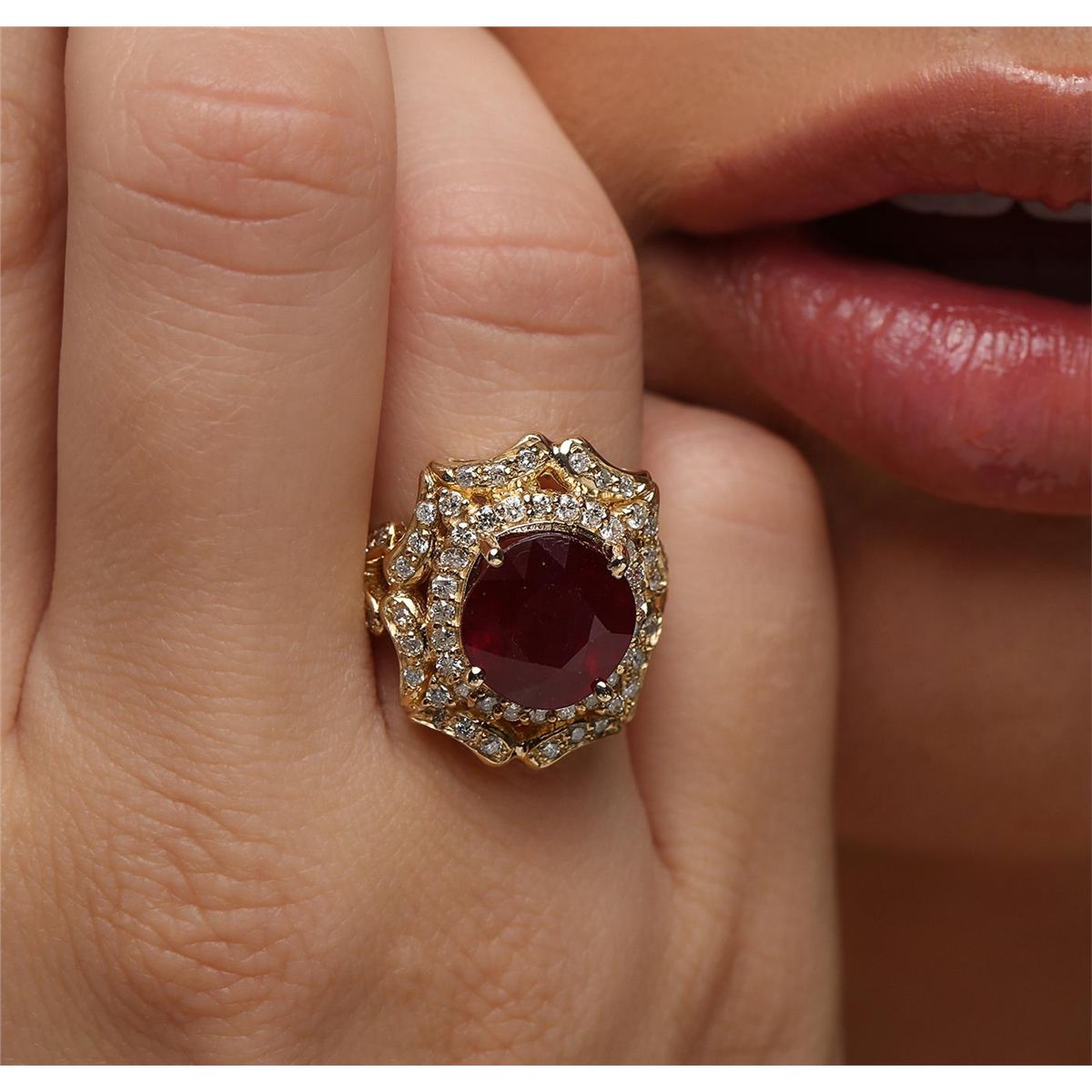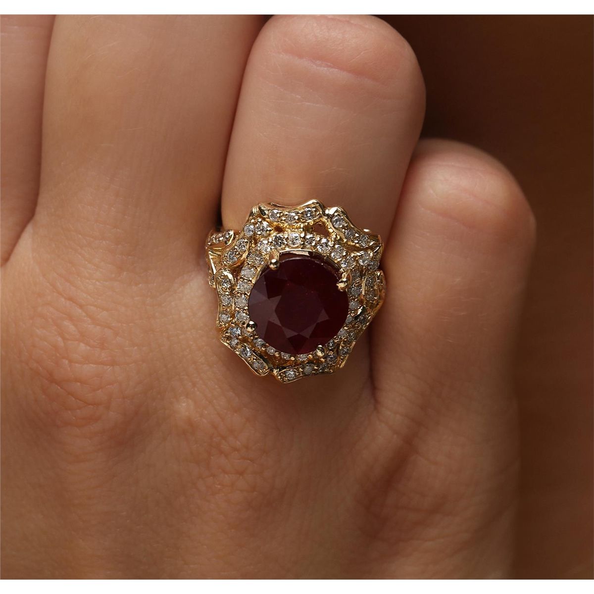 One electronically tested 14KT yellow gold Ladies combination cast & assembled ring with a bright polish finish. Condition is new. Identified with markings of "14K". Containing: One prong set round modified brilliant cut natural ruby, measuring 10.75 - 10.57 x 7.35 mm, approximate weight of 1.70ct., clarity is heavily included, medium, moderately strong, strongly purplish red color, (GIA stpR 5/4), cut is good. Colored gemstones are presumed to have been subjected to commonly used color/clarity enhancement processes. Sixty-Two prong set round brilliant cut diamonds, measuring 1.50 - 1.50 x 0.90mm (depth est.) approximate. Total Weight of 62 Stones = 0.76ct. Clarity: I-1 to I-2. Color: I - K, Cut is Good. All grading of diamonds and colored gemstones in this piece of jewelry are graded in the mounting, unless otherwise stated. Total Weight of Colored Stones 1.70ct. Total Weight of Diamonds 0.76ct. Total Weight of Ring 10.00 grams. GGL Appraised at $5,585.00.