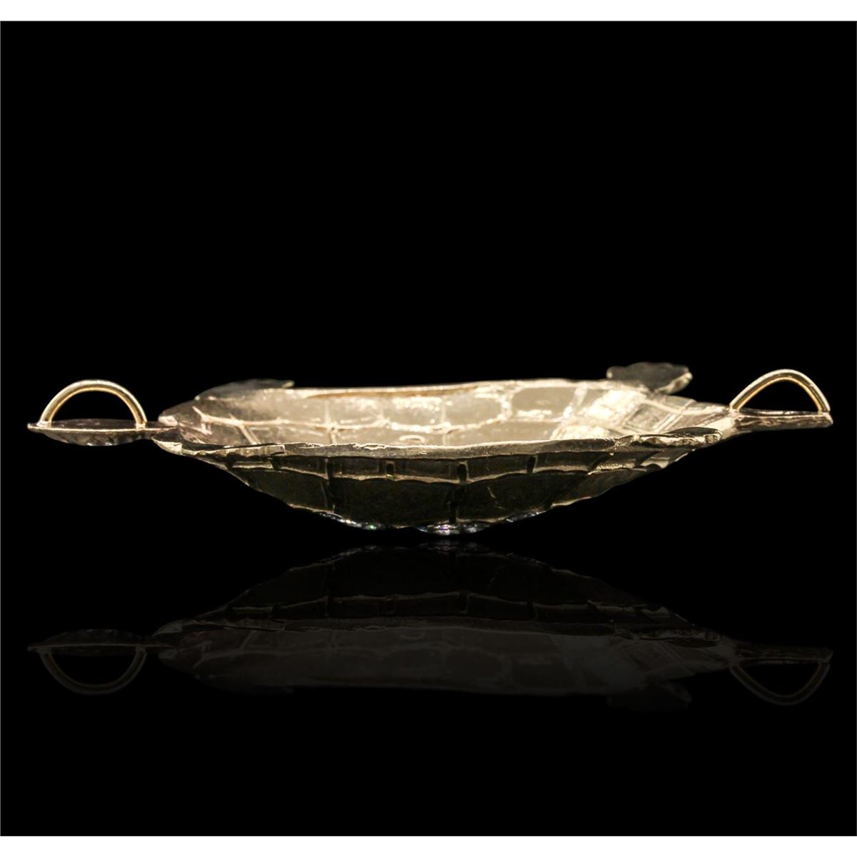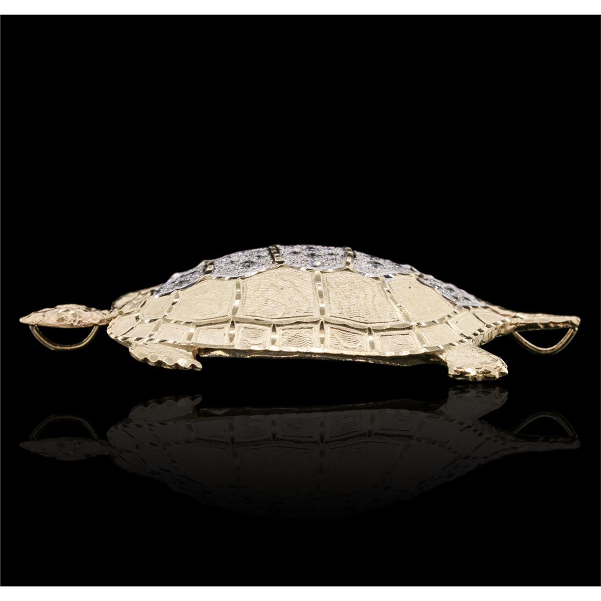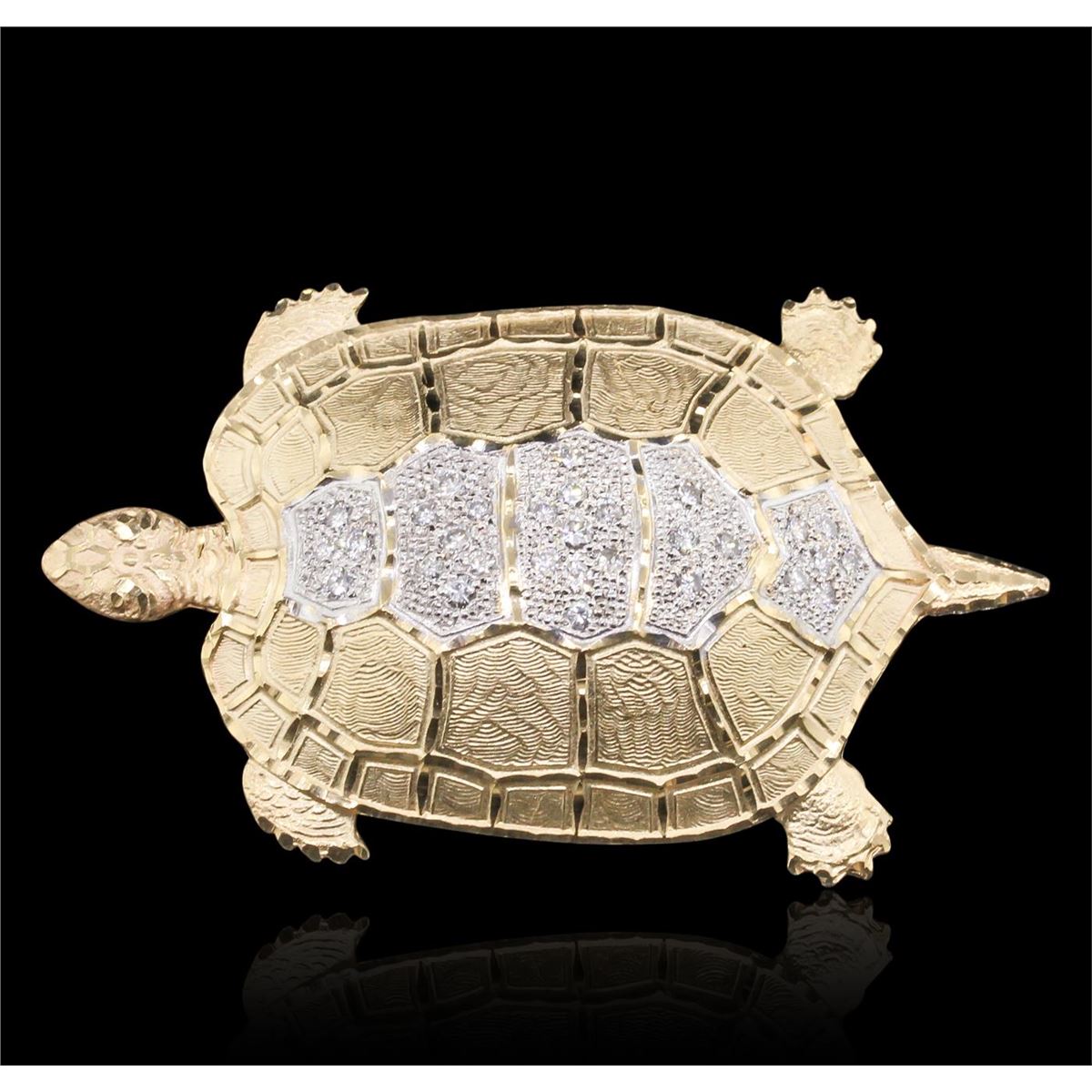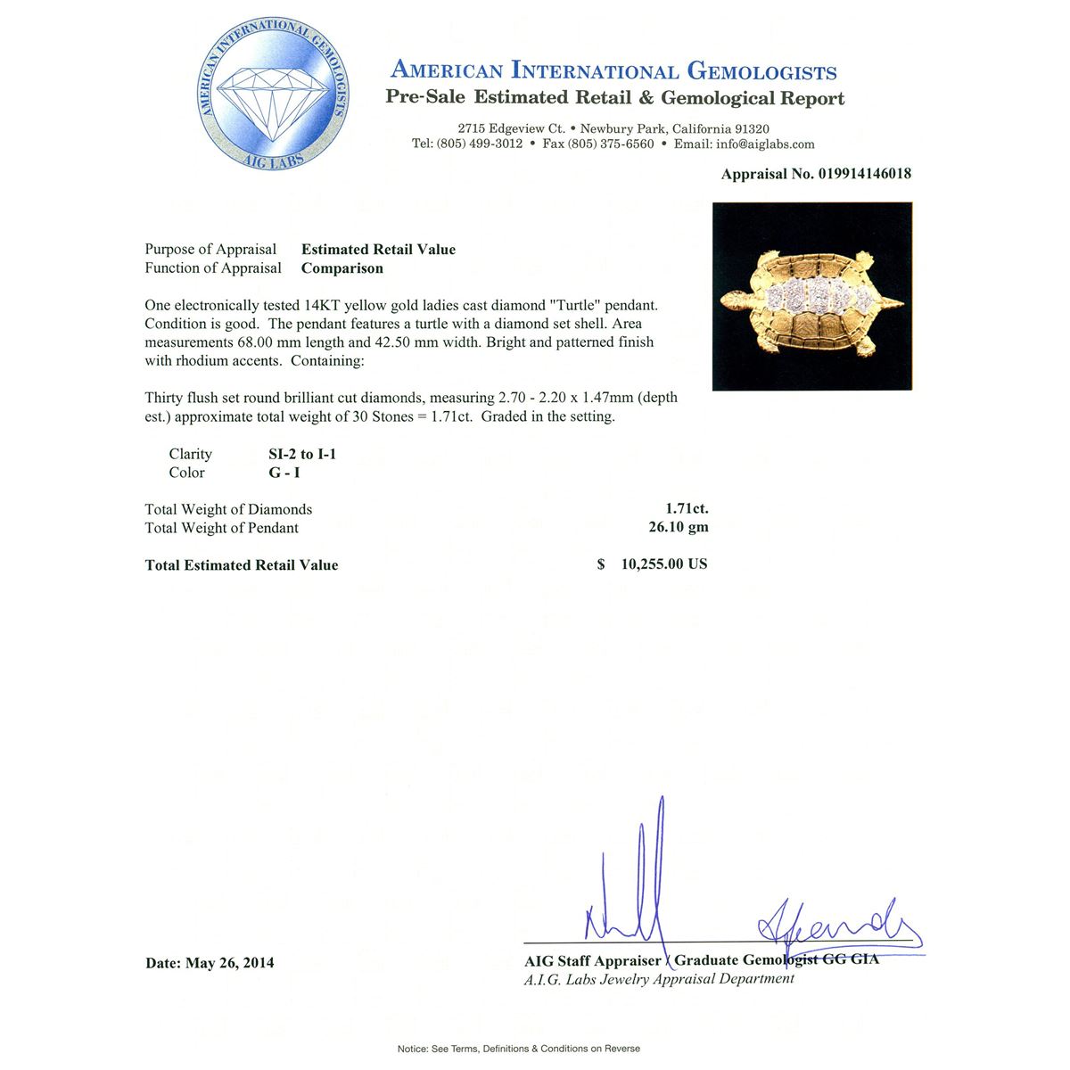 One electronically tested 14KT yellow gold ladies cast diamond "Turtle" pendant. Condition is good. The pendant features a turtle with a diamond set shell. Area measurements 68.00 mm length and 42.50 mm width. Bright and patterned finish with rhodium accents. Containing: Thirty flush set round brilliant cut diamonds, measuring 2.70 - 2.20 x 1.47mm (depth est.) approximate. Total Weight of 30 Stones = 1.71ct. Graded in the setting. Clarity: SI-2 to I-1. Color: G - I. Total Weight of Diamonds 1.71ct. Total Weight of Pendant 26.10 grams. AIG Appraised at $10,255.00.