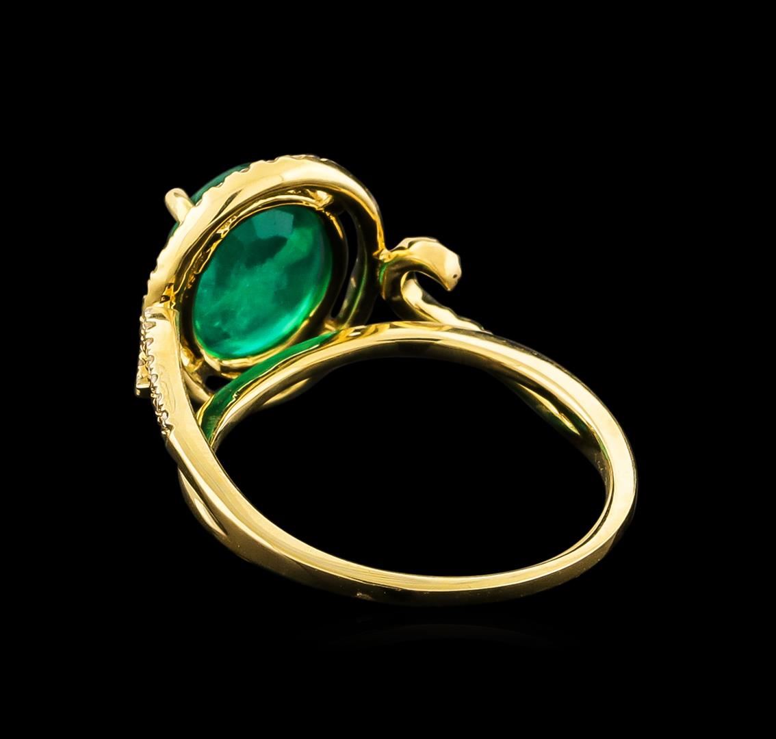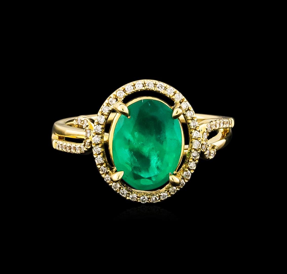 One electronically tested 14KT yellow gold ladies cast emerald and diamond ring with a bright polish finish. Condition is new, good workmanship. The featured emerald is set within a diamond bezel supported by diamond set shoulders, completed by a one millimeter wide band. Trademark is PMI. Identified with markings of "14K". Containing: One prong set oval mixed cut natural emerald, measuring 9.80 x 7.60 x 3.95mm, 6%. bulge factor, approximate weight of 1.72ct., clarity is heavily included, type III, medium dark, very slightly grayish, very slightly bluish green color, (GIA vslbG 6/3), cut is good. Transmitting light with a minimum of distortion, transparent. Naturally occurring internal & external characteristics are present. Indications of oil residue. Graded in the setting. Fifty-One prong set round brilliant cut diamonds, measuring 1.10 - 1.00 x 0.63mm (depth est.) approximate. Total Weight of 51 Stones = 0.31ct. Graded in the setting. Clarity: SI-1 to I-1. Color: G - I. Total Weight of Colored Stones 1.72ct. Total Weight of Diamonds 0.31ct. Total Weight of Ring 3.16 grams. AIG Appraised at $3,795.00.