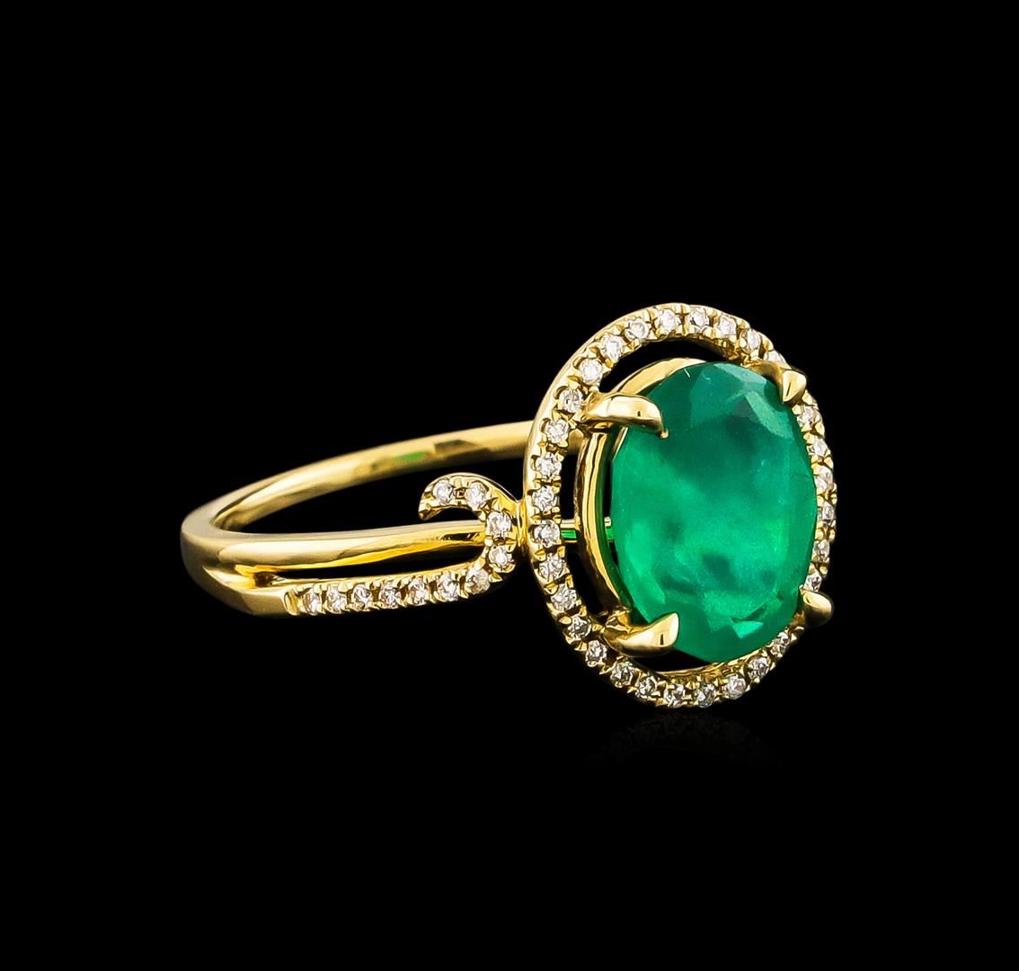 One electronically tested 14KT yellow gold ladies cast emerald and diamond ring with a bright polish finish. Condition is new, good workmanship. The featured emerald is set within a diamond bezel supported by diamond set shoulders, completed by a one millimeter wide band. Trademark is PMI. Identified with markings of "14K". Containing: One prong set oval mixed cut natural emerald, measuring 9.80 x 7.60 x 3.95mm, 6%. bulge factor, approximate weight of 1.72ct., clarity is heavily included, type III, medium dark, very slightly grayish, very slightly bluish green color, (GIA vslbG 6/3), cut is good. Transmitting light with a minimum of distortion, transparent. Naturally occurring internal & external characteristics are present. Indications of oil residue. Graded in the setting. Fifty-One prong set round brilliant cut diamonds, measuring 1.10 - 1.00 x 0.63mm (depth est.) approximate. Total Weight of 51 Stones = 0.31ct. Graded in the setting. Clarity: SI-1 to I-1. Color: G - I. Total Weight of Colored Stones 1.72ct. Total Weight of Diamonds 0.31ct. Total Weight of Ring 3.16 grams. AIG Appraised at $3,795.00.