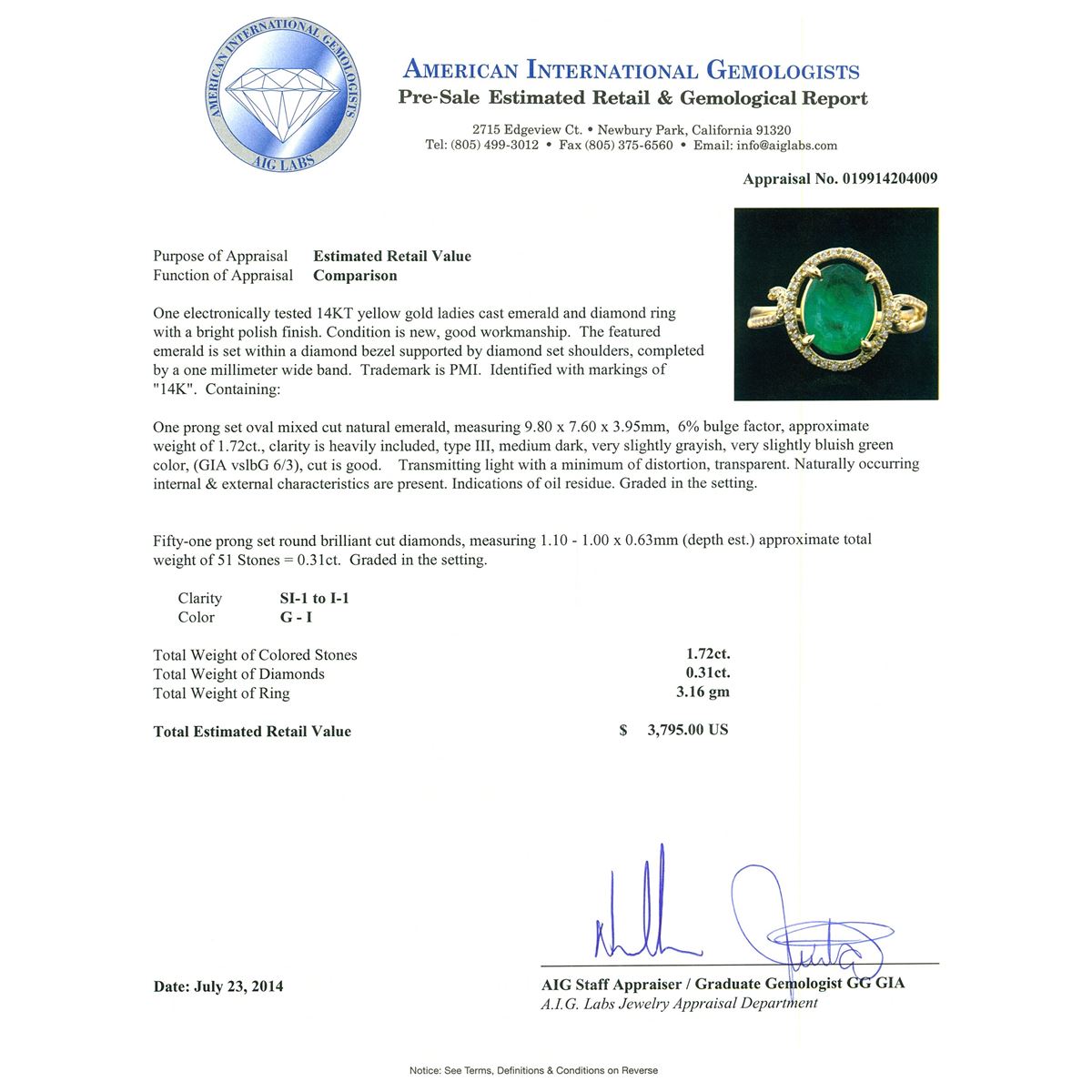 One electronically tested 14KT yellow gold ladies cast emerald and diamond ring with a bright polish finish. Condition is new, good workmanship. The featured emerald is set within a diamond bezel supported by diamond set shoulders, completed by a one millimeter wide band. Trademark is PMI. Identified with markings of "14K". Containing: One prong set oval mixed cut natural emerald, measuring 9.80 x 7.60 x 3.95mm, 6%. bulge factor, approximate weight of 1.72ct., clarity is heavily included, type III, medium dark, very slightly grayish, very slightly bluish green color, (GIA vslbG 6/3), cut is good. Transmitting light with a minimum of distortion, transparent. Naturally occurring internal & external characteristics are present. Indications of oil residue. Graded in the setting. Fifty-One prong set round brilliant cut diamonds, measuring 1.10 - 1.00 x 0.63mm (depth est.) approximate. Total Weight of 51 Stones = 0.31ct. Graded in the setting. Clarity: SI-1 to I-1. Color: G - I. Total Weight of Colored Stones 1.72ct. Total Weight of Diamonds 0.31ct. Total Weight of Ring 3.16 grams. AIG Appraised at $3,795.00.