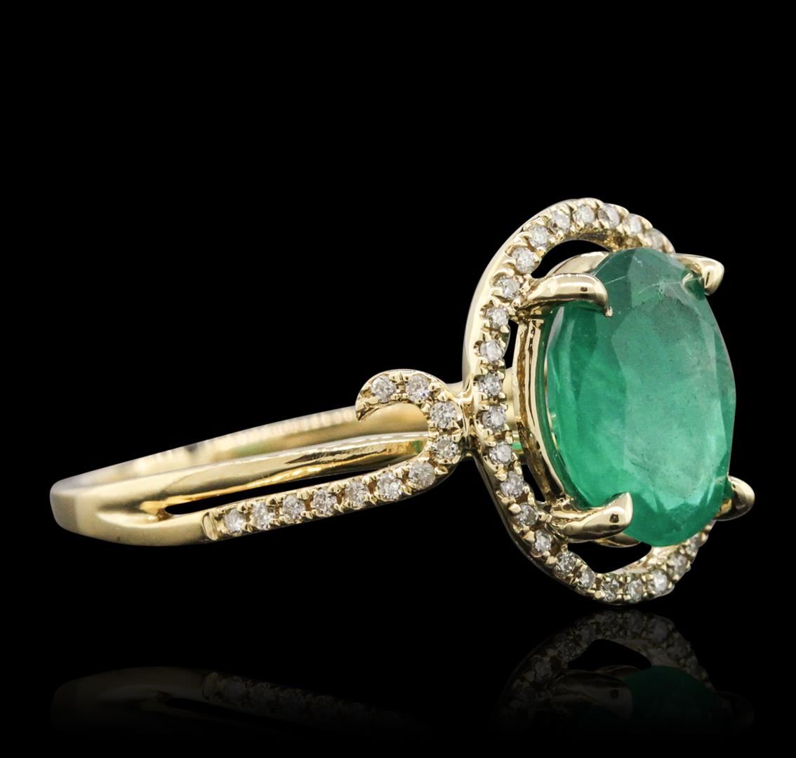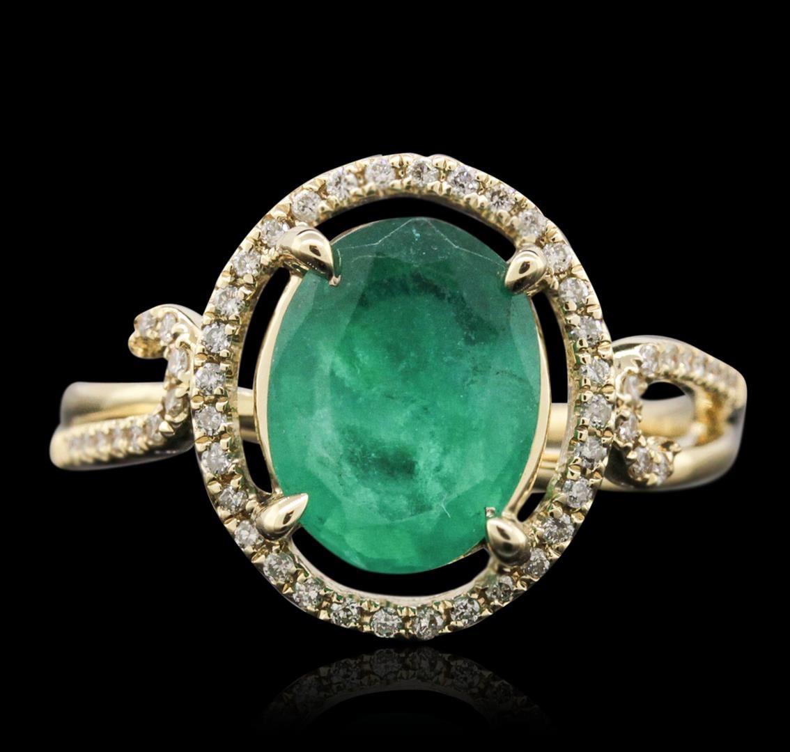 One electronically tested 14KT yellow gold ladies cast emerald and diamond ring with a bright polish finish. Condition is new, good workmanship. The featured emerald is set within a diamond bezel supported by diamond set shoulders, completed by a one millimeter wide band. Trademark is PMI. Identified with markings of "14K". Containing: One prong set oval mixed cut natural emerald, measuring 9.80 x 7.60 x 3.95mm, 6%. bulge factor, approximate weight of 1.72ct., clarity is heavily included, type III, medium dark, very slightly grayish, very slightly bluish green color, (GIA vslbG 6/3), cut is good. Transmitting light with a minimum of distortion, transparent. Naturally occurring internal & external characteristics are present. Indications of oil residue. Graded in the setting. Fifty-One prong set round brilliant cut diamonds, measuring 1.10 - 1.00 x 0.63mm (depth est.) approximate. Total Weight of 51 Stones = 0.31ct. Graded in the setting. Clarity: SI-1 to I-1. Color: G - I. Total Weight of Colored Stones 1.72ct. Total Weight of Diamonds 0.31ct. Total Weight of Ring 3.16 grams. AIG Appraised at $3,795.00.