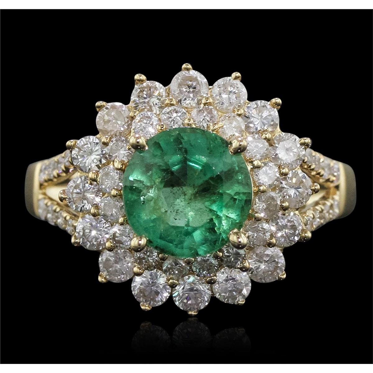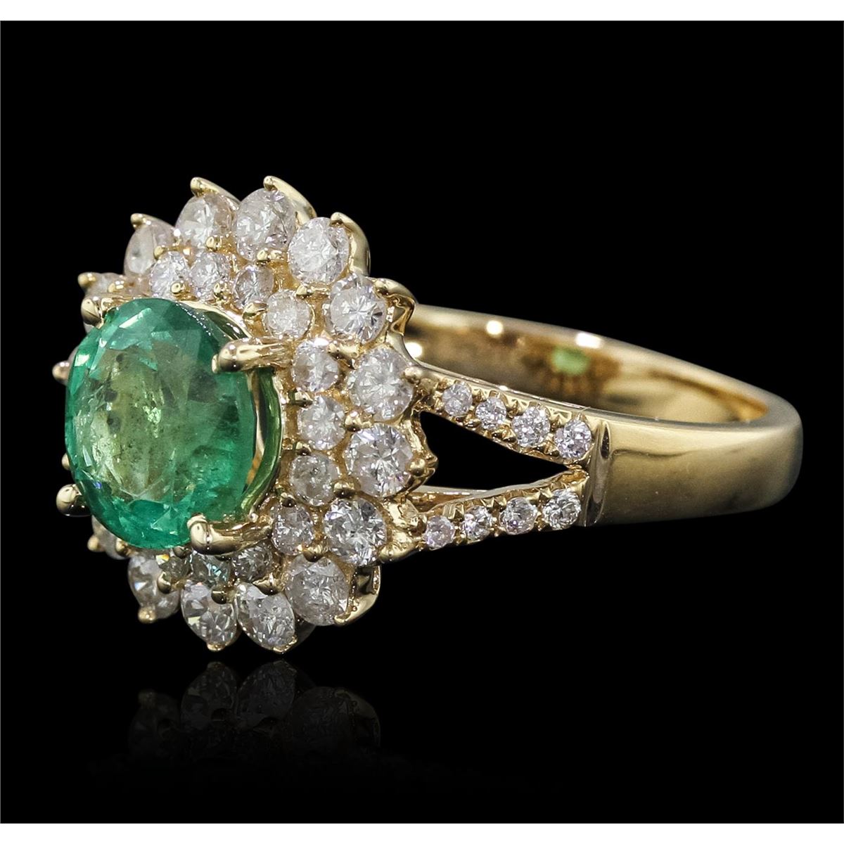 One electronically tested 14KT yellow gold ladies cast emerald and diamond ring with a bright polish finish. Condition is new, good workmanship. The featured emerald is set within a floral diamond bezel, supported by diamond set split shoulders and completed by a two millimeter wide band. Trademark is Orianne. Identified with markings of "14K". Containing: One prong set round mixed cut natural emerald, measuring 7.80 - 7.70 x 5.00 mm, 6%. bulge factor, approximate weight of 1.75ct., clarity is heavily included, type III, medium, very slightly grayish, very slightly bluish green color, (GIA vslbG 5/3), cut is good. Transmitting light with a minimum of distortion, transparent to translucent. Naturally occurring internal & external characteristics are present. Indications of oil residue. Graded in the setting. Sixteen prong set round brilliant cut diamonds, measuring 2.40 - 2.30 x 1.41mm (depth est.) approximate. Total Weight of 16 Stones = 0.86ct. Graded in the setting. Clarity: I-1 to I-2 . Color: G - I Sixteen prong set round brilliant cut diamonds, measuring 1.70 - 1.50 x 0.96mm (depth est.) approximate. Total Weight of 16 Stones = 0.31ct. Graded in the setting. Clarity: SI-2 to I-2 . Color: G - I Sixteen prong set round brilliant cut diamonds, measuring 1.20 - 1.00 x 0.66mm (depth est.) approximate. Total Weight of 16 Stones = 0.10ct. Graded in the setting. Clarity: SI-2 to I-2 . Color: G - I. Total Weight of Colored Stones 1.75ct.. Total Weight of Diamonds 1.27ct.. Total Weight of Ring 5.20gm. AIG Appraised at $5,100.00.