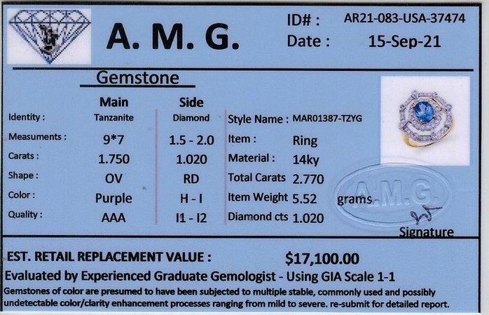(1) Tanzanite with a total weight of 1.75cts. (50) round Diamonds with a total weight of 1.02cts with a color of H-I and clarity of I2-I3. Total weight of the ring is 4.60 grams. Ring size 7.5.