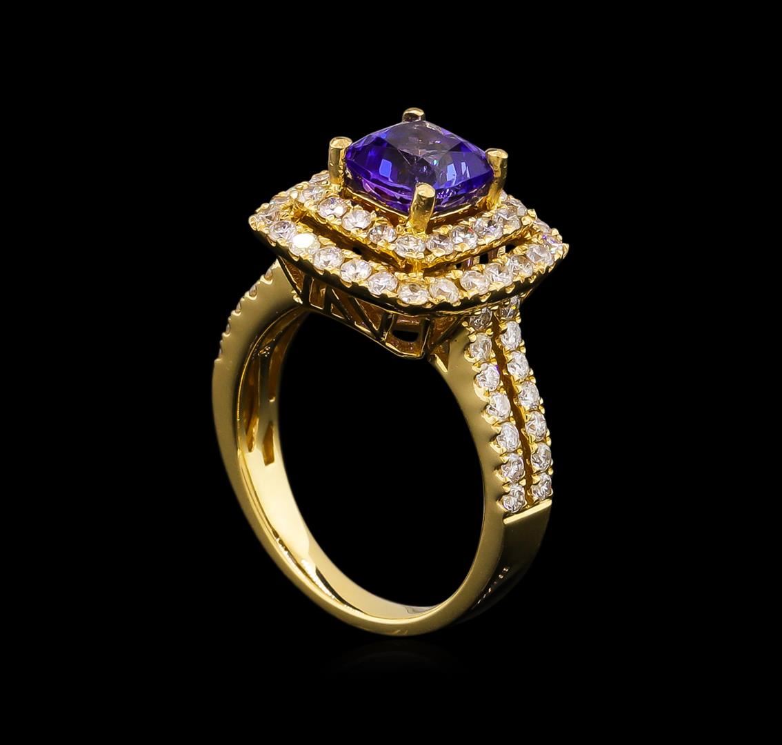 One electronically tested 14KT yellow gold Ladies combination cast & assembled ring with a bright polish finish. Condition is new. Identified with markings of "14K". Containing: One prong set square cushion modified brilliant cut natural tanzanite, measuring 7.00 x 7.00 x 4.55mm, approximate weight of 1.76ct., clarity is eye clean, type I, medium, moderately strong, bluish violet color, (GIA bV 5/4), cut is good. Colored gemstones are presumed to have been subjected to commonly used color/clarity enhancement processes. Seventy prong set round brilliant cut diamonds, measuring 1.50 - 1.50 x 0.90mm (depth est.) approximate. Total Weight of 70 Stones = 0.86ct. Clarity: I-1 to I-2. Color: J - K, Cut is Good. Total Weight of Colored Stones 1.76ct. Total Weight of Diamonds 0.86ct. Total Weight of Ring 6.80 grams. GGL Appraised at $6,920.00.
