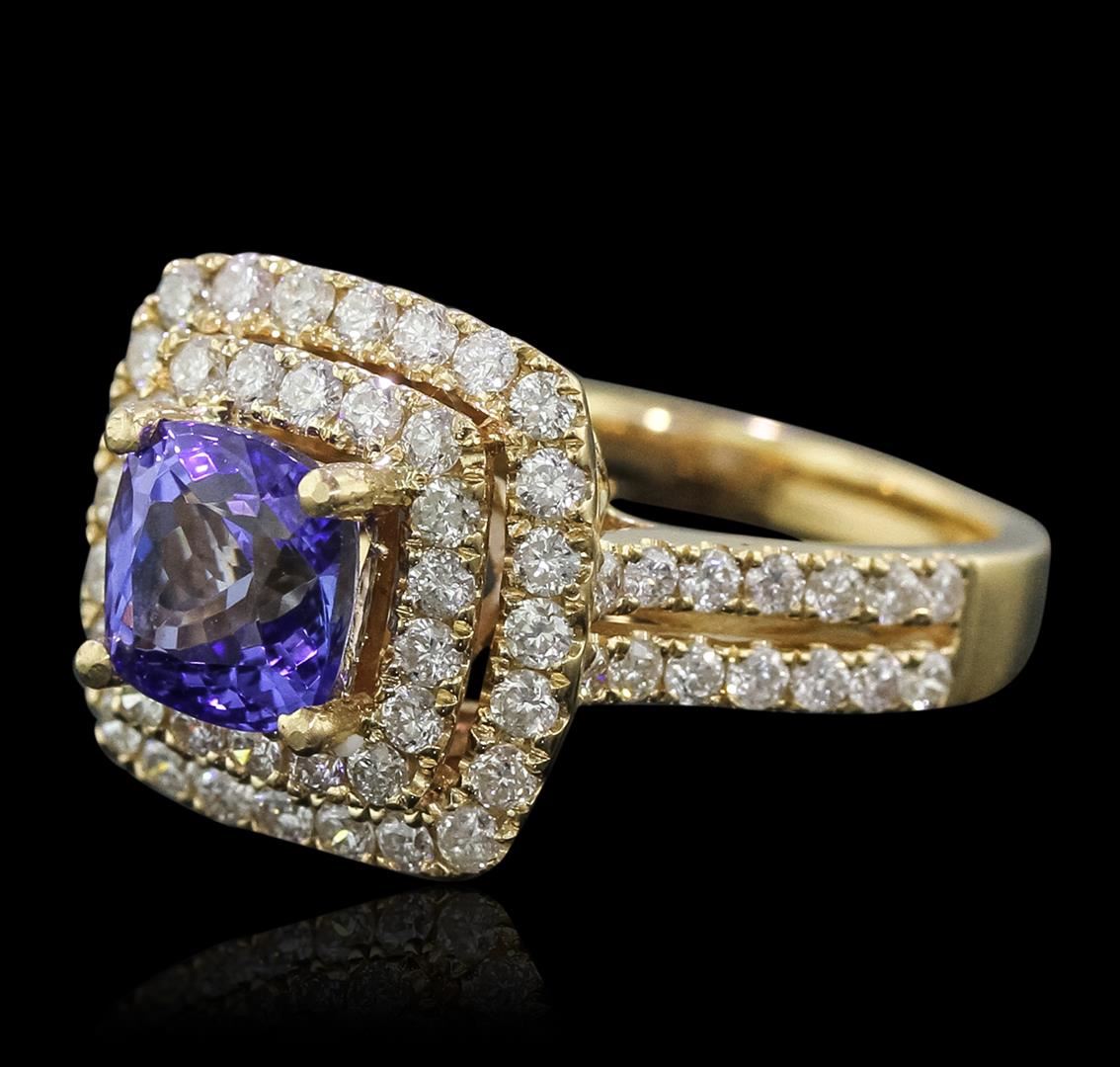 One electronically tested 14KT yellow gold Ladies combination cast & assembled ring with a bright polish finish. Condition is new. Identified with markings of "14K". Containing: One prong set square cushion modified brilliant cut natural tanzanite, measuring 7.00 x 7.00 x 4.55mm, approximate weight of 1.76ct., clarity is eye clean, type I, medium, moderately strong, bluish violet color, (GIA bV 5/4), cut is good. Colored gemstones are presumed to have been subjected to commonly used color/clarity enhancement processes. Seventy prong set round brilliant cut diamonds, measuring 1.50 - 1.50 x 0.90mm (depth est.) approximate. Total Weight of 70 Stones = 0.86ct. Clarity: I-1 to I-2. Color: J - K, Cut is Good. Total Weight of Colored Stones 1.76ct. Total Weight of Diamonds 0.86ct. Total Weight of Ring 6.80 grams. GGL Appraised at $6,920.00.