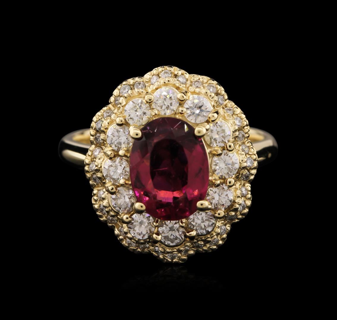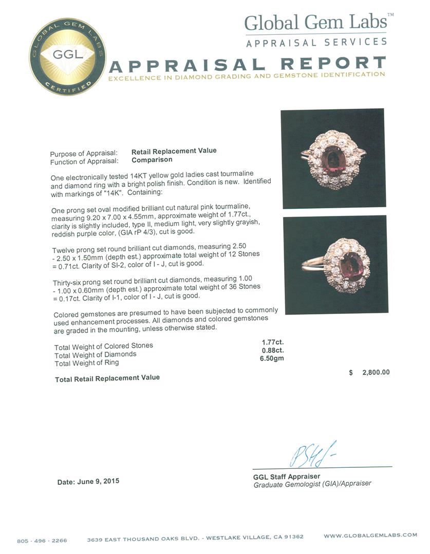 One electronically tested 14KT yellow gold ladies cast tourmaline and diamond ring with a bright polish finish. Identified with markings of "14K". Condition is new. Containing: One prong set oval modified brilliant cut natural pink tourmaline, measuring 9.20 x 7.00 x 4.55mm, approximate weight of 1.77ct., clarity is slightly included, type II, medium light, very slightly grayish, reddish purple color, (GIA rP 4/3), cut is good. Twelve prong set round brilliant cut diamonds, measuring 2.50 - 2.50 x 1.50mm (depth est.) approximate total weight of 12 Stones = 0.71ct. Clarity: SI-2. Color: I - J, Cut is Good. Thirty-Six prong set round brilliant cut diamonds, measuring 1.00 - 1.00 x 0.60mm (depth est.) approximate total weight of 36 Stones = 0.17ct. Clarity: I-1. Color: I - J, Cut is Good. Colored gemstones are presumed to have been subjected to commonly used enhancement processes. All diamonds and colored gemstones are graded in the mounting, unless otherwise stated. Total Weight of Colored Stones 1.77ct. Total Weight of Diamonds 0.88ct. Total Weight of Ring 6.50 grams. GGL Appraised at $2,800.00.