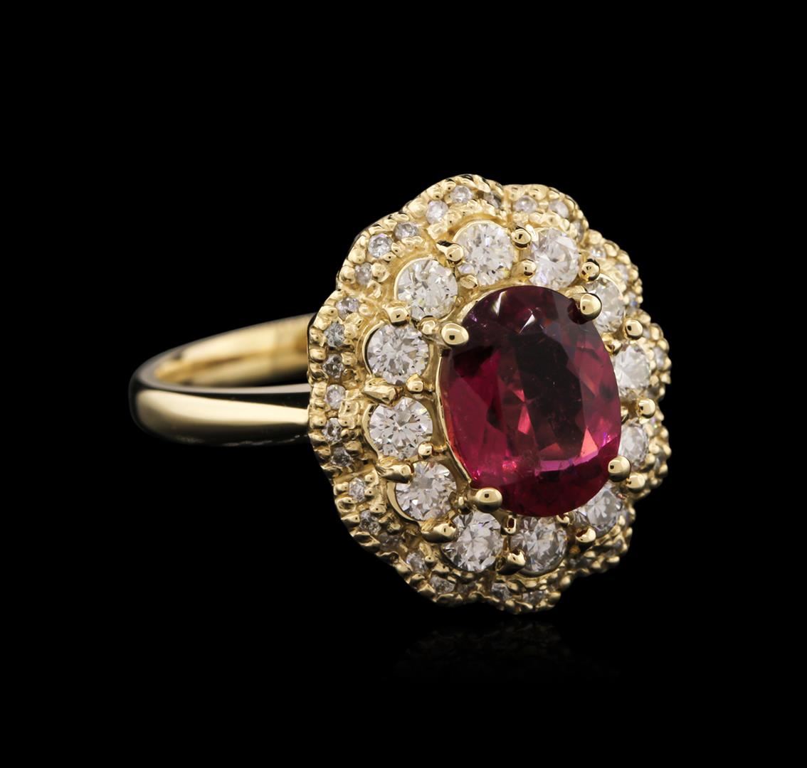 One electronically tested 14KT yellow gold ladies cast tourmaline and diamond ring with a bright polish finish. Identified with markings of "14K". Condition is new. Containing: One prong set oval modified brilliant cut natural pink tourmaline, measuring 9.20 x 7.00 x 4.55mm, approximate weight of 1.77ct., clarity is slightly included, type II, medium light, very slightly grayish, reddish purple color, (GIA rP 4/3), cut is good. Twelve prong set round brilliant cut diamonds, measuring 2.50 - 2.50 x 1.50mm (depth est.) approximate total weight of 12 Stones = 0.71ct. Clarity: SI-2. Color: I - J, Cut is Good. Thirty-Six prong set round brilliant cut diamonds, measuring 1.00 - 1.00 x 0.60mm (depth est.) approximate total weight of 36 Stones = 0.17ct. Clarity: I-1. Color: I - J, Cut is Good. Colored gemstones are presumed to have been subjected to commonly used enhancement processes. All diamonds and colored gemstones are graded in the mounting, unless otherwise stated. Total Weight of Colored Stones 1.77ct. Total Weight of Diamonds 0.88ct. Total Weight of Ring 6.50 grams. GGL Appraised at $2,800.00.