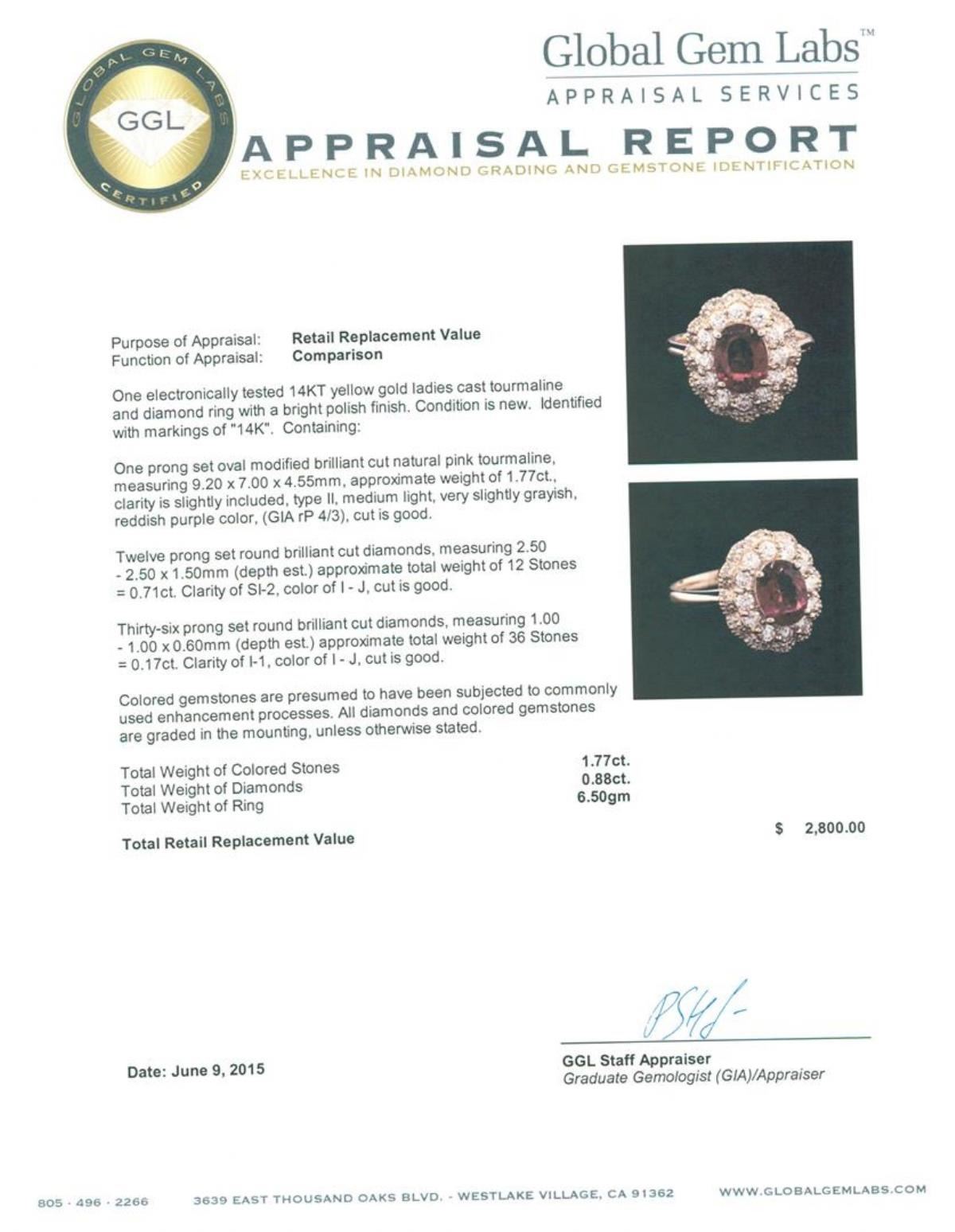 One electronically tested 14KT yellow gold ladies cast tourmaline and diamond ring with a bright polish finish. Identified with markings of "14K". Condition is new. Containing: One prong set oval modified brilliant cut natural pink tourmaline, measuring 9.20 x 7.00 x 4.55mm, approximate weight of 1.77ct., clarity is slightly included, type II, medium light, very slightly grayish, reddish purple color, (GIA rP 4/3), cut is good. Twelve prong set round brilliant cut diamonds, measuring 2.50 - 2.50 x 1.50mm (depth est.) approximate total weight of 12 Stones = 0.71ct. Clarity: SI-2. Color: I - J, Cut is Good. Thirty-Six prong set round brilliant cut diamonds, measuring 1.00 - 1.00 x 0.60mm (depth est.) approximate total weight of 36 Stones = 0.17ct. Clarity: I-1. Color: I - J, Cut is Good. Colored gemstones are presumed to have been subjected to commonly used enhancement processes. All diamonds and colored gemstones are graded in the mounting, unless otherwise stated. Total Weight of Colored Stones 1.77ct. Total Weight of Diamonds 0.88ct. Total Weight of Ring 6.50 grams. GGL Appraised.