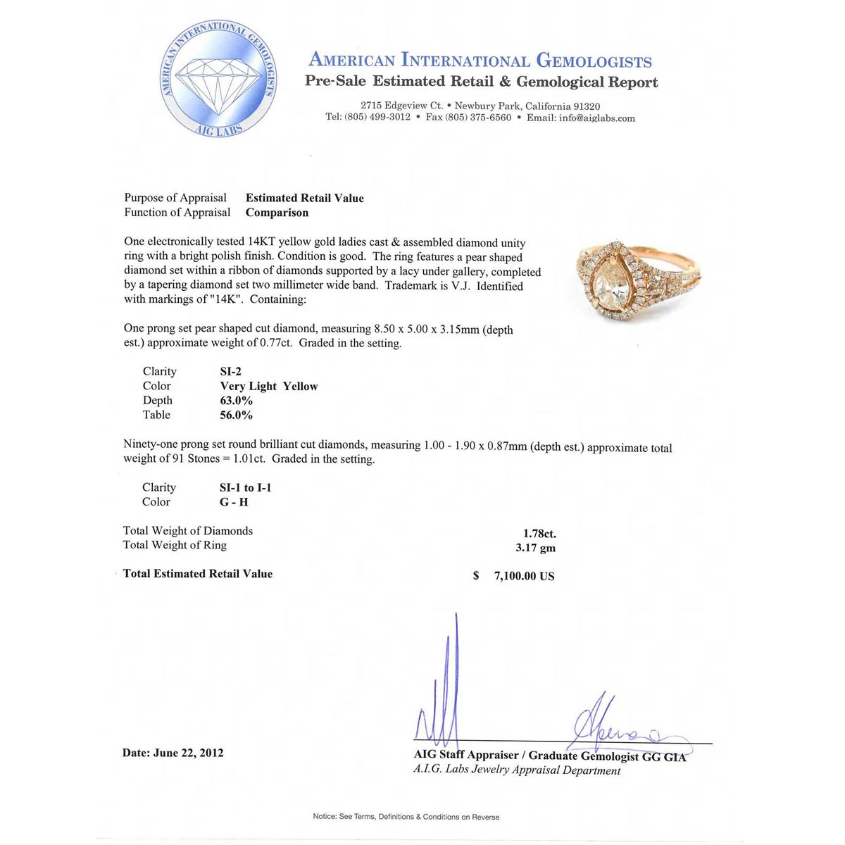 One electronically tested 14KT yellow gold ladies cast & assembled diamond unity ring with a bright polish finish. Condition is good. The ring features a pear shaped diamond set within a ribbon of diamond supported by a lacy under gallery, completed by a tapering diamond set two millimeter wide band. Trademark is V.J. Identified with markings of "14K". Containing: One prong set pear shaped cut diamond, measuring 8.50 x 5.00 x 3.15mm (depth est.) approximate weight of 0.77ct. Graded in the setting. Clarity: SI-2. Color: Very Light Yellow. Depth: 63.0%. Table: 56.0%. Ninety-one prong set round brilliant cut diamonds, measuring 1.00 -1.90 x 0.87mm (depth est.) approximate total weight of 91 Stones = 1.01ct. Graded in the setting. Clarity: SI-1 to I-1. Color: G-H. Total Weight of Diamonds: 1.78ct. Total Weight of ring: 3.17gm. AIG Appraised at $7,100.00.