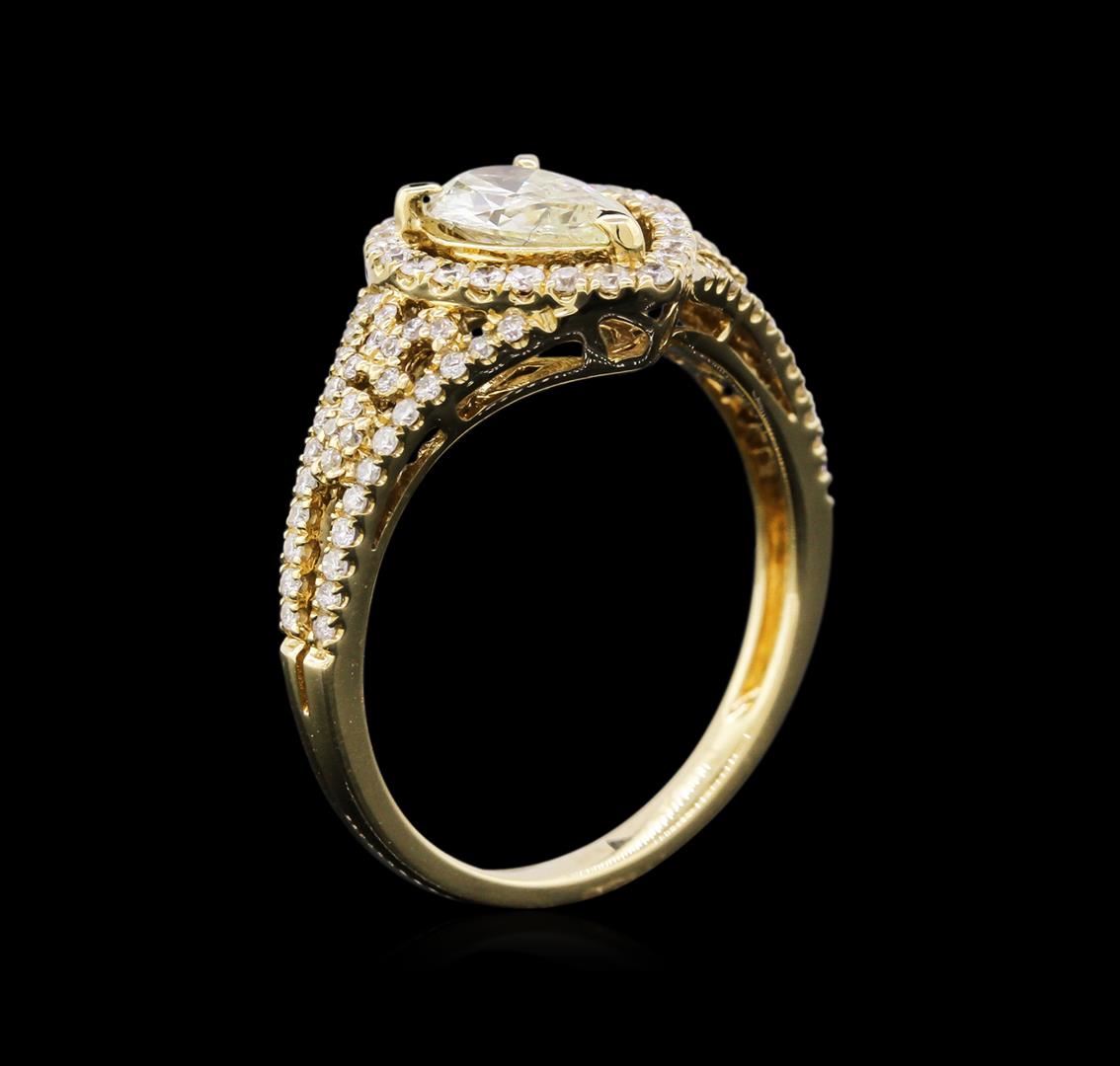 One electronically tested 14KT yellow gold ladies cast & assembled diamond unity ring with a bright polish finish. Condition is good. The ring features a pear shaped diamond set within a ribbon of diamond supported by a lacy under gallery, completed by a tapering diamond set two millimeter wide band. Trademark is V.J. Identified with markings of "14K". Containing: One prong set pear shaped cut diamond, measuring 8.50 x 5.00 x 3.15mm (depth est.) approximate weight of 0.77ct. Graded in the setting. Clarity: SI-2. Color: Very Light Yellow. Depth: 63.0%. Table: 56.0%. Ninety-one prong set round brilliant cut diamonds, measuring 1.00 -1.90 x 0.87mm (depth est.) approximate total weight of 91 Stones = 1.01ct. Graded in the setting. Clarity: SI-1 to I-1. Color: G-H. Total Weight of Diamonds: 1.78ct. Total Weight of ring: 3.17gm. AIG Appraised at $7,100.00.