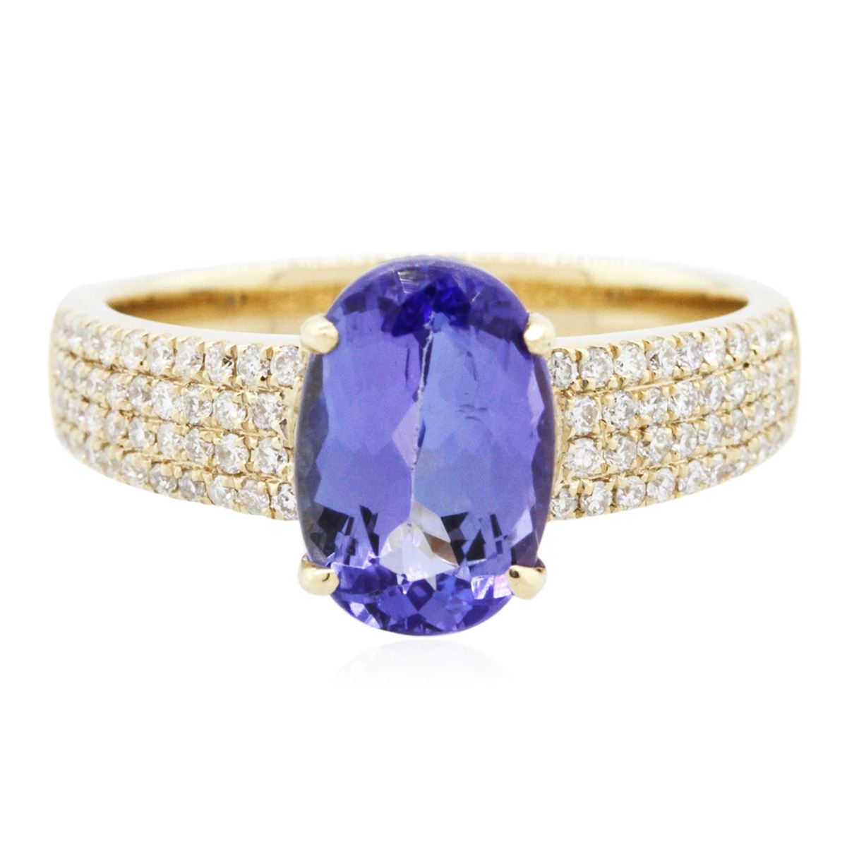 One electronically tested 14KT yellow gold ladies combination cast & assembled tanzanite and diamond ring with a flat shank with a bright polish finish. Identified with markings of "14K". Condition is new. Containing: One prong set oval modified brilliant cut natural tanzanite, measuring 10.05 x 6.80 x 3.75mm, approximate weight of 1.78ct., clarity is eye clean, type I, medium, very slightly grayish, violet color, (GIA V 5/3), cut is good. Eighty prong set round brilliant cut diamonds, measuring 1.10 - 1.10 x 0.66mm (depth est.) approximate total weight of 80 Stones = 0.38ct. Clarity: I-1 to I-2. Color: I - J, Cut is Good. Colored gemstones are presumed to have been subjected to commonly used enhancement processes. All diamonds and colored gemstones are graded in the mounting, unless otherwise stated total weight of Colored Stones 1.78ct. Total Weight of Diamonds 0.38ct. Total Weight of Ring 4.00 grams. GGL Appraised at $5,250.00.
