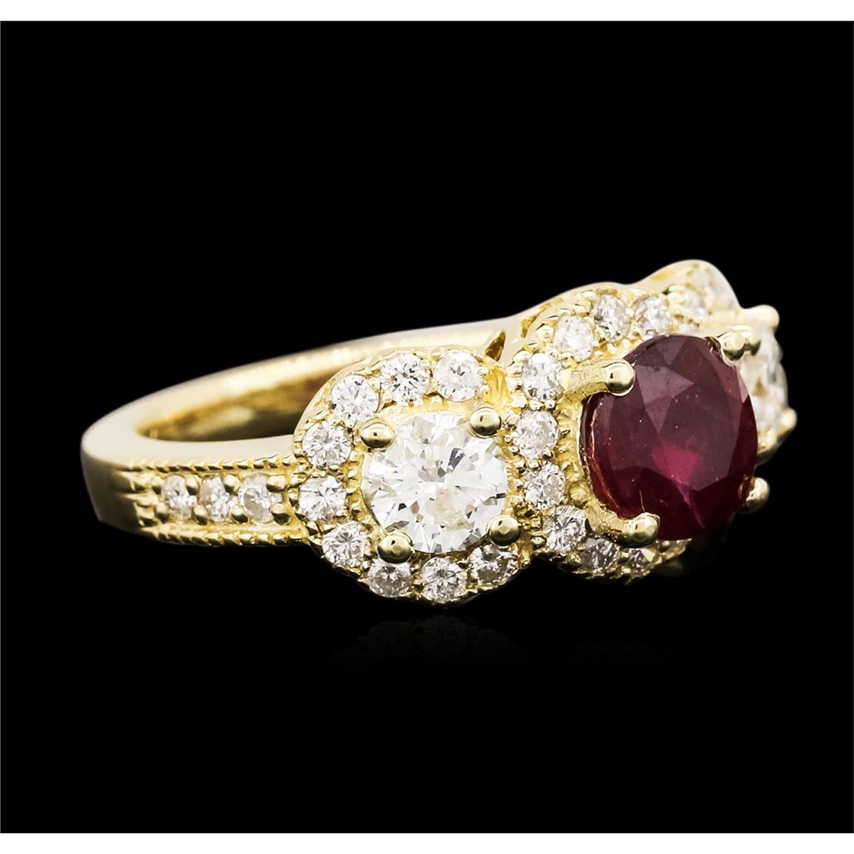 One electronically tested 14KT yellow gold ladies cast ruby and diamond ring with a bright polish finish. Identified with markings of "K14". Condition is new. Containing: One prong set round modified brilliant cut natural ruby, measuring 7.00 - 7.00 x 4.55 mm, approximate weight of 1.78ct., clarity is heavily included, type II, medium dark, moderately strong, strongly purplish red color, (GIA stpR 6/4), cut is good. Two prong set round brilliant cut diamonds, measuring 4.50 - 4.50 x 2.70mm (depth est.) approximate total weight of 2 Stones = 0.67ct. Clarity: SI-2 to I-1. Color: J - K, Cut is Good. Thirty-Six prong set round brilliant cut diamonds, measuring 1.50 - 1.50 x 0.90mm (depth est.) approximate total weight of 36 Stones = 0.44ct. Clarity: SI-2 to I-1. Color: J, Cut is Good. Colored gemstones are presumed to have been subjected to commonly used enhancement processes. All diamonds and colored gemstones are graded in the mounting, unless otherwise stated. Total Weight of Colored Stones 1.78ct. Total Weight of Diamonds 1.11ct. Total Weight of Ring 6.60 grams. GGL Appraised at $5,465.00.