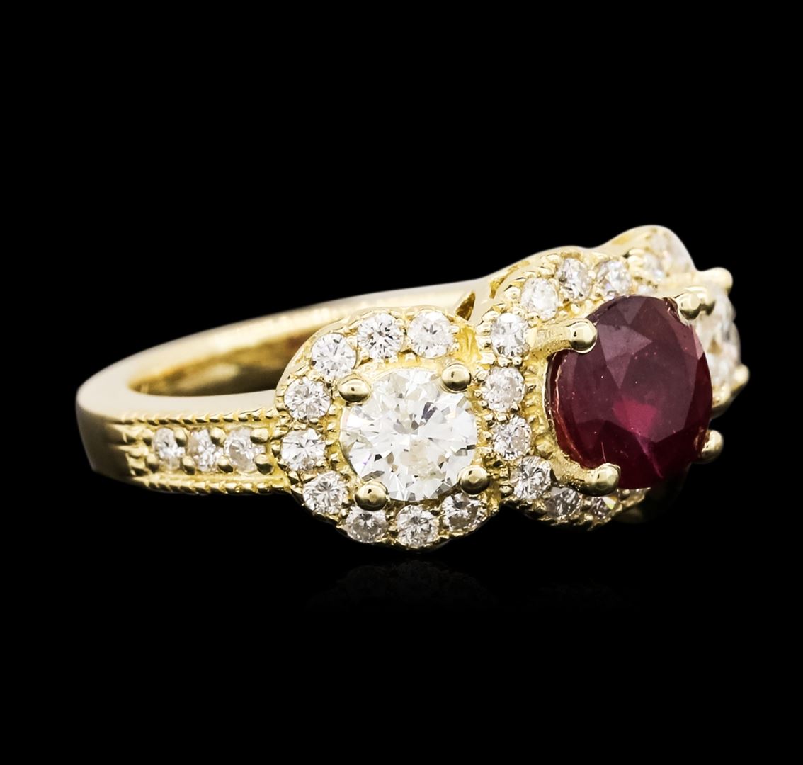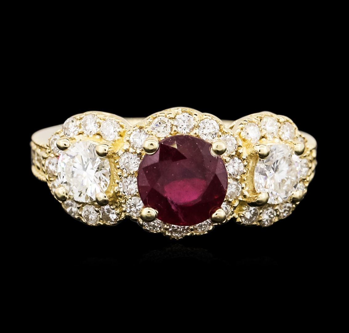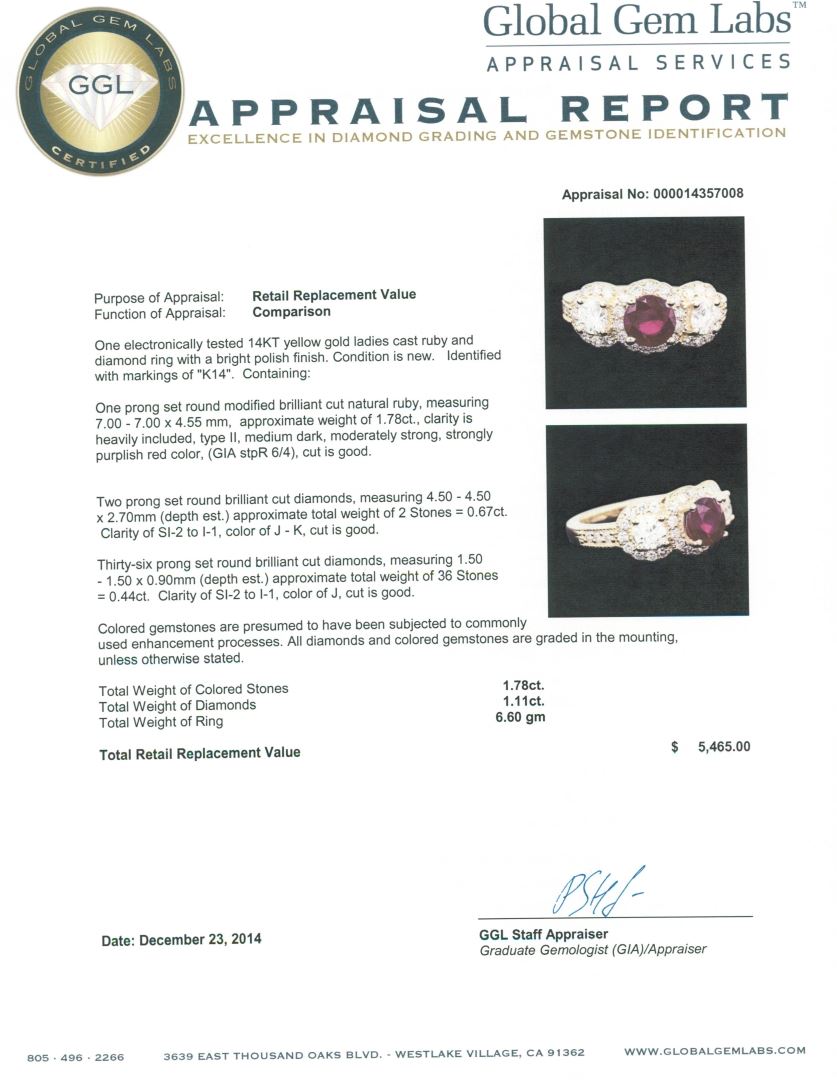 One electronically tested 14KT yellow gold ladies cast ruby and diamond ring with a bright polish finish. Identified with markings of "K14". Condition is new. Containing: One prong set round modified brilliant cut natural ruby, measuring 7.00 - 7.00 x 4.55 mm, approximate weight of 1.78ct., clarity is heavily included, type II, medium dark, moderately strong, strongly purplish red color, (GIA stpR 6/4), cut is good. Two prong set round brilliant cut diamonds, measuring 4.50 - 4.50 x 2.70mm (depth est.) approximate total weight of 2 Stones = 0.67ct. Clarity: SI-2 to I-1. Color: J - K, Cut is Good. Thirty-Six prong set round brilliant cut diamonds, measuring 1.50 - 1.50 x 0.90mm (depth est.) approximate total weight of 36 Stones = 0.44ct. Clarity: SI-2 to I-1. Color: J, Cut is Good. Colored gemstones are presumed to have been subjected to commonly used enhancement processes. All diamonds and colored gemstones are graded in the mounting, unless otherwise stated. Total Weight of Colored Stones 1.78ct. Total Weight of Diamonds 1.11ct. Total Weight of Ring 6.60 grams. GGL Appraised at $5,465.00.