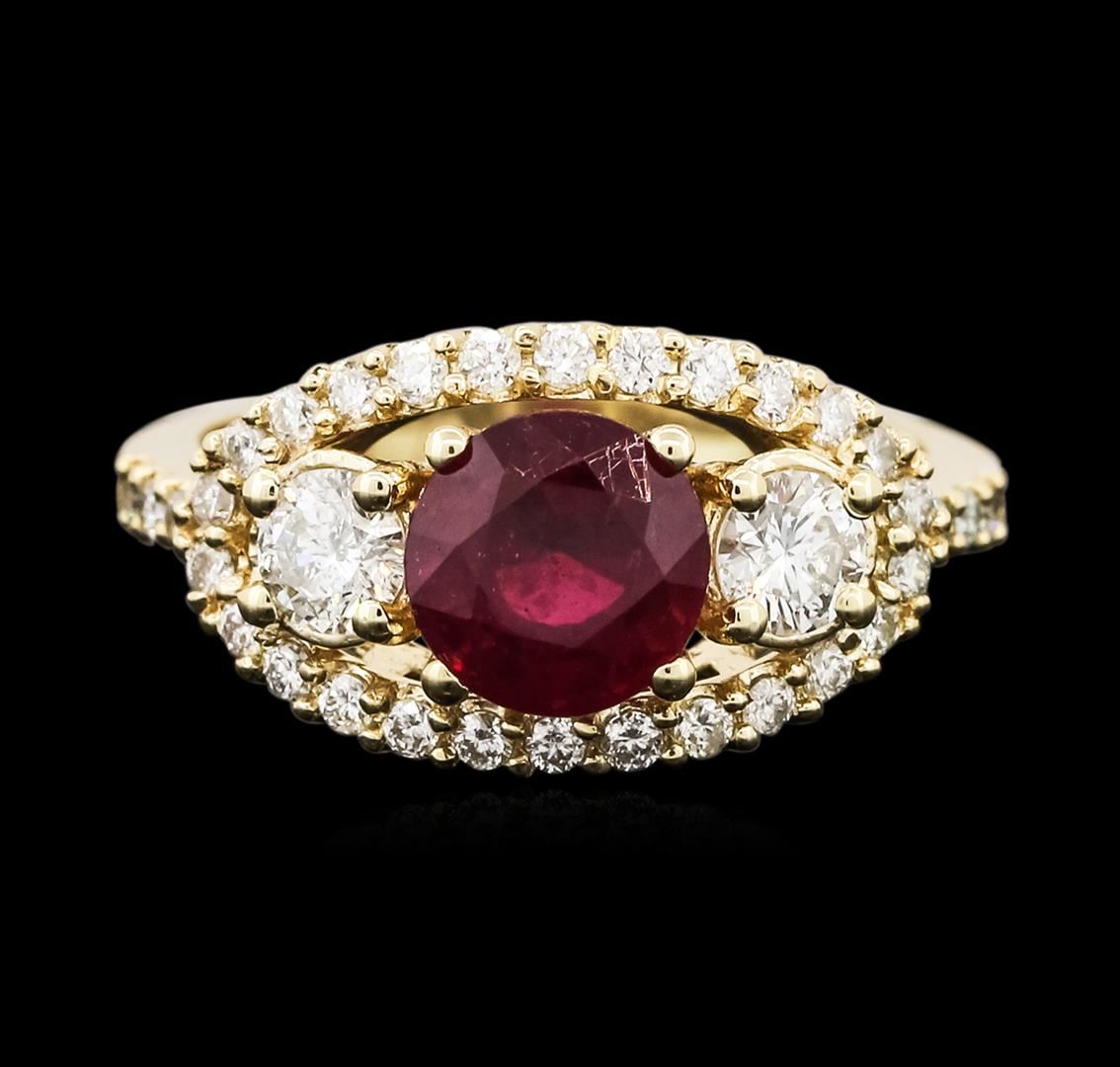 One electronically tested 14KT yellow gold ladies cast ruby and diamond ring with a bright polish finish. Identified with markings of "K14". Condition is new. Containing: One prong set round modified brilliant cut natural ruby, measuring 7.00 - 7.00 x 4.55 mm, approximate weight of 1.78ct., clarity is heavily included, type II, medium dark, moderately strong, strongly purplish red color, (GIA stpR 6/4), cut is good. Two prong set round brilliant cut diamonds, measuring 3.80 - 3.80 x 2.28mm (depth est.) approximate total weight of 2 Stones = 0.40ct. Clarity: SI-2. Color: K, Cut is Good. Thirty-Two prong set round brilliant cut diamonds, measuring 1.30 - 1.30 x 0.78mm (depth est.) approximate total weight of 32 Stones = 0.26ct. Clarity: SI-2 to I-1. Color: I - J, Cut is Good. Colored gemstones are presumed to have been subjected to commonly used enhancement processes. All diamonds and colored gemstones are graded in the mounting, unless otherwise stated. Total Weight of Colored Stones 1.78ct. Total Weight of Diamonds 0.66ct. Total Weight of Ring 4.90 grams. GGL Appraised at $3,415.00.