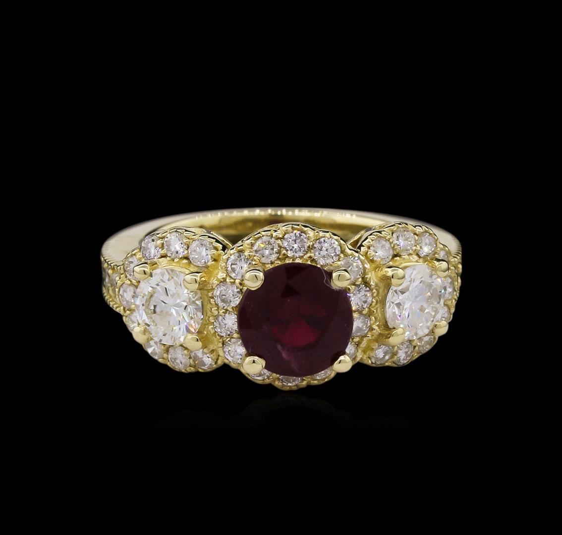 One electronically tested 14KT yellow gold ladies cast ruby and diamond ring with a bright polish finish. Identified with markings of "K14". Condition is new. Containing: One prong set round modified brilliant cut natural ruby, measuring 7.00 - 7.00 x 4.55 mm, approximate weight of 1.78ct., clarity is heavily included, type II, medium dark, moderately strong, strongly purplish red color, (GIA stpR 6/4), cut is good. Two prong set round brilliant cut diamonds, measuring 4.50 - 4.50 x 2.70mm (depth est.) approximate total weight of 2 Stones = 0.67ct. Clarity: SI-2 to I-1. Color: J - K, Cut is Good. Thirty-Six prong set round brilliant cut diamonds, measuring 1.50 - 1.50 x 0.90mm (depth est.) approximate total weight of 36 Stones = 0.44ct. Clarity: SI-2 to I-1. Color: J, Cut is Good. Colored gemstones are presumed to have been subjected to commonly used enhancement processes. All diamonds and colored gemstones are graded in the mounting, unless otherwise stated. Total Weight of Colored Stones 1.78ct. Total Weight of Diamonds 1.11ct. Total Weight of Ring 6.60 grams. GGL Appraised at $5,465.00.