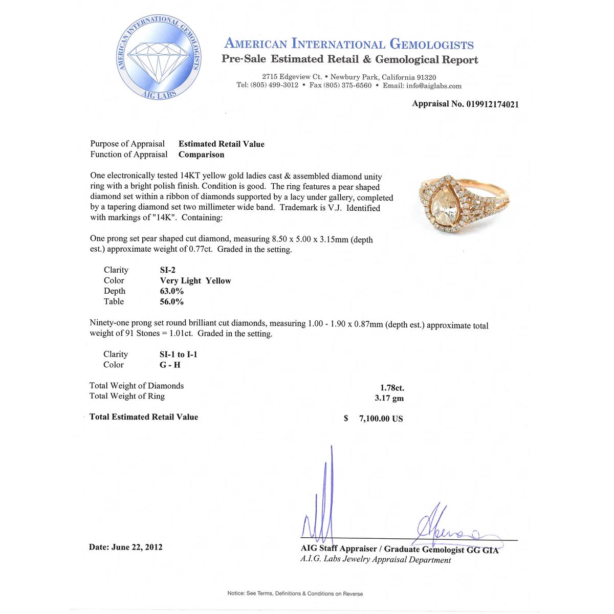 One electronically tested 14KT yellow gold ladies cast & assembled diamond unity ring with a bright polish finish. Condition is good. The ring features a pear shaped diamond set within a ribbon of diamond supported by a lacy under gallery, completed by a tapering diamond set two millimeter wide band. Trademark is V.J. Identified with markings of "14K". Containing: One prong set pear shaped cut diamond, measuring 8.50 x 5.00 x 3.15mm (depth est.) approximate weight of 0.77ct. Graded in the setting. Clarity: SI-2. Color: Very Light Yellow. Depth: 63.0%. Table: 56.0%. Ninety-one prong set round brilliant cut diamonds, measuring 1.00 -1.90 x 0.87mm (depth est.) approximate total weight of 91 Stones = 1.01ct. Graded in the setting. Clarity: SI-1 to I-1. Color: G-H. Total Weight of Diamonds: 1.78ct. Total Weight of ring: 3.17gm. AIG Appraised at $7,100.00.