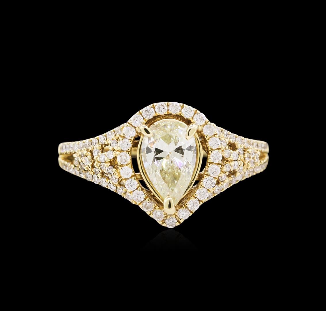 One electronically tested 14KT yellow gold ladies cast & assembled diamond unity ring with a bright polish finish. Condition is good. The ring features a pear shaped diamond set within a ribbon of diamond supported by a lacy under gallery, completed by a tapering diamond set two millimeter wide band. Trademark is V.J. Identified with markings of "14K". Containing: One prong set pear shaped cut diamond, measuring 8.50 x 5.00 x 3.15mm (depth est.) approximate weight of 0.77ct. Graded in the setting. Clarity: SI-2. Color: Very Light Yellow. Depth: 63.0%. Table: 56.0%. Ninety-one prong set round brilliant cut diamonds, measuring 1.00 -1.90 x 0.87mm (depth est.) approximate total weight of 91 Stones = 1.01ct. Graded in the setting. Clarity: SI-1 to I-1. Color: G-H. Total Weight of Diamonds: 1.78ct. Total Weight of ring: 3.17gm. AIG Appraised at $7,100.00.