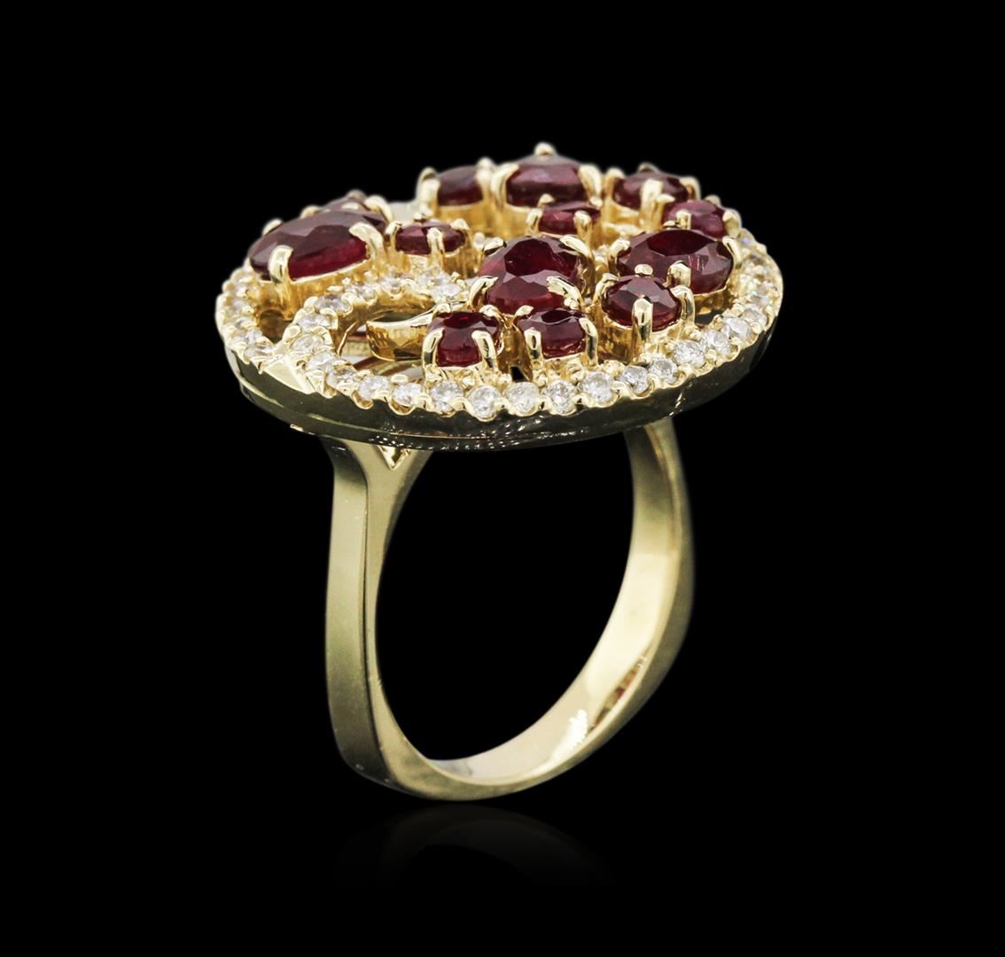 One electronically tested 14KT yellow gold ladies cast ruby and diamond ring with a bright polish finish. Identified with markings of "14K". Condition is new. Containing: Thirteen prong set oval modified brilliant cut natural rubies, measuring 2.00 x 3.00 x 1.95mm, approximate total weight of 1.30ct., clarity is heavily included, type II, medium dark, moderately strong, slightly purplish red color, (GIA slpR 6/4), cut is good. Sixty prong set round brilliant cut diamonds, measuring 1.70 - 1.70 x 1.02mm (depth est.) approximate total weight of 60 Stones = 1.07ct. Clarity: SI-2 to I-1. Color: K - L, Cut is Good. Colored gemstones are presumed to have been subjected to commonly used enhancement processes. All diamonds and colored gemstones are graded in the mounting, unless otherwise stated. Total Weight of Colored Stones 1.30ct. Total Weight of Diamonds 1.07ct. Total Weight of Ring 10.60 grams. GGL Appraised at $4,115.00.