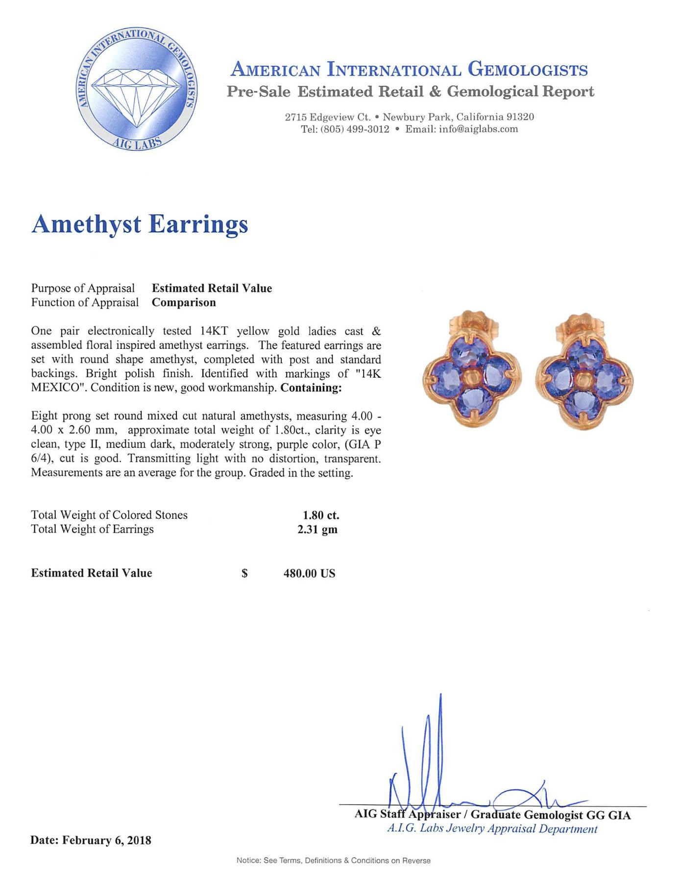 One 14KT Yellow Gold 1.80ctw Amethyst Earrings. One pair electronically tested 14KT yellow gold ladies cast & assembled floral inspired amethyst earrings. The featured earrings are set with round shape amethyst, completed with post and standard backings. Bright polish finish. Identified with markings of "14K MEXICO". Condition is new, good workmanship. Containing: Eight prong set round mixed cut natural amethysts, measuring 4.00 - 4.00 x 2.60 mm, approximate total weight of 1.80ct., clarity is eye clean, type II, medium dark, moderately strong, purple color, (GIA P 6/4), cut is good. Transmitting light with no distortion, transparent. Measurements are an average for the group. Graded in the setting. Total Weight of Colored Stones 1.80 ct. Total Weight of Earrings 2.31 gm.