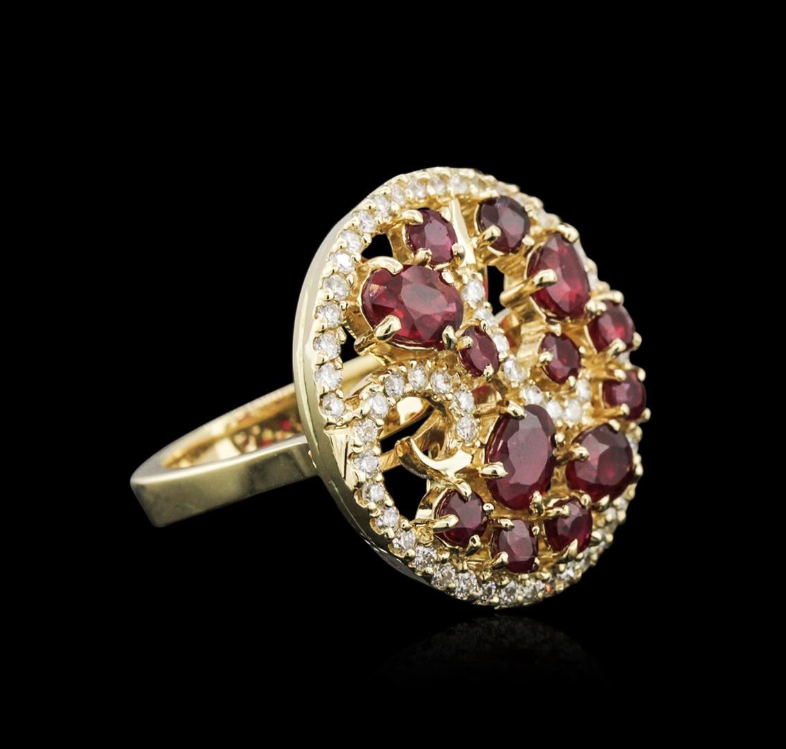 One electronically tested 14KT yellow gold ladies cast ruby and diamond ring with a bright polish finish. Identified with markings of "14K". Condition is new. Containing: Thirteen prong set oval modified brilliant cut natural rubies, measuring 2.00 x 3.00 x 1.95mm, approximate total weight of 1.30ct., clarity is heavily included, type II, medium dark, moderately strong, slightly purplish red color, (GIA slpR 6/4), cut is good. Sixty prong set round brilliant cut diamonds, measuring 1.70 - 1.70 x 1.02mm (depth est.) approximate total weight of 60 Stones = 1.07ct. Clarity: SI-2 to I-1. Color: K - L, Cut is Good. Colored gemstones are presumed to have been subjected to commonly used enhancement processes. All diamonds and colored gemstones are graded in the mounting, unless otherwise stated. Total Weight of Colored Stones 1.30ct. Total Weight of Diamonds 1.07ct. Total Weight of Ring 10.60 grams. GGL Appraised at $4,115.00.