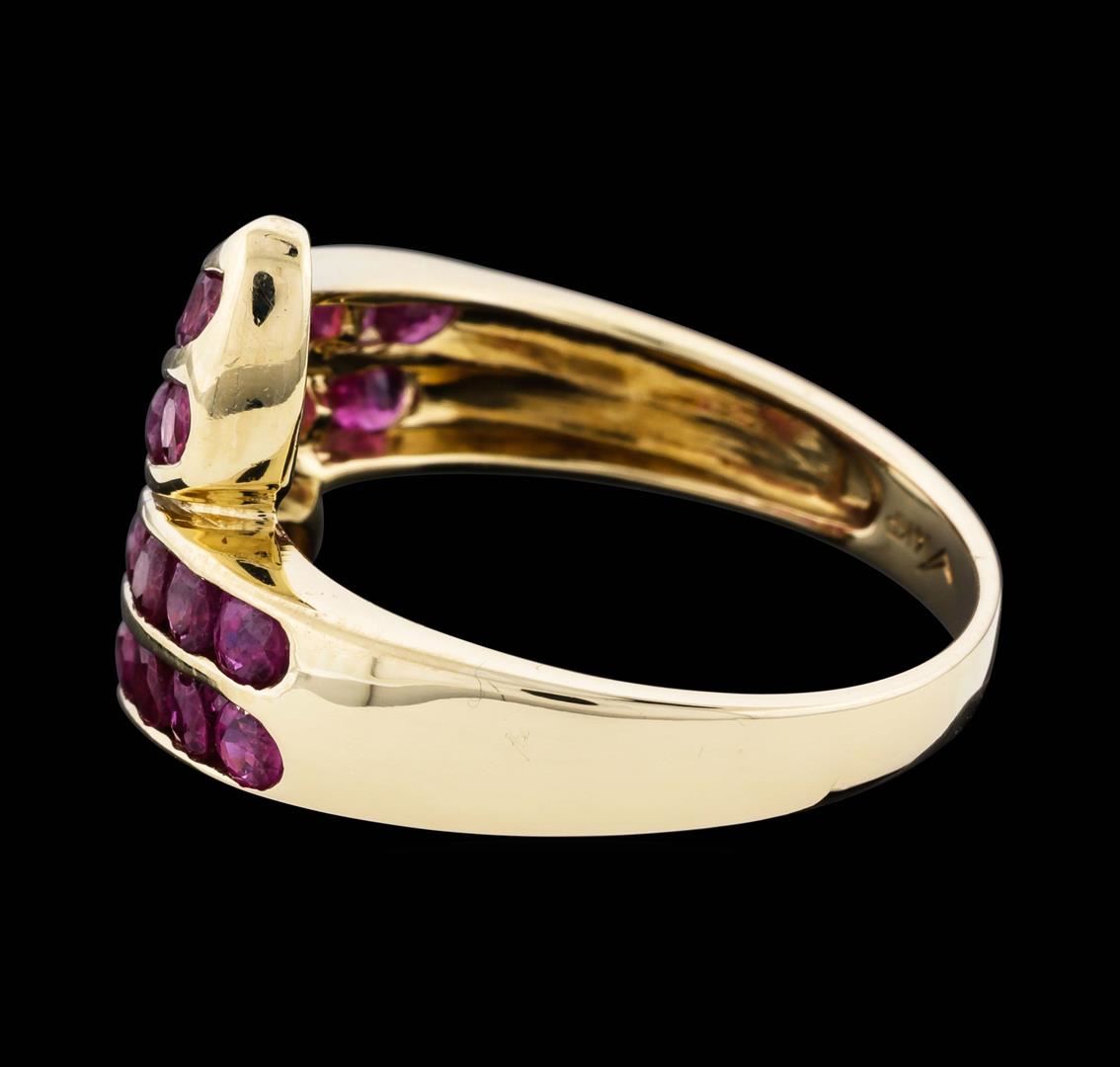 One electronically tested 14KT yellow gold lady's cast fashion ring with a bypass shank with a bright polish finish. The featured lady's ring has a shank measuring 2.63 millimeters wide. Identified with markings of "14KP". Condition is new, good workmanship. Containing: Twenty-four channel set round modified brilliant cut natural rubies, measuring 2.40 - 2.30 x 1.53 mm, (depth est.) approximate total weight of 1.80ct., clarity is heavily included, medium, moderately strong, slightly purplish red color, (GIA slpR 5/4), cut is good. Transmitting light somewhat diffusely, semi-transparent to translucent. Naturally occurring internal & external characteristics are present. Indications of laboratory high temperature heat treatment. Colored gemstones are presumed to have been subjected to commonly used enhancement processes. Graded in the setting. Total Weight of Colored Stones 1.80ct. Total Weight of Ring 3.40gm. GAS Appraised.