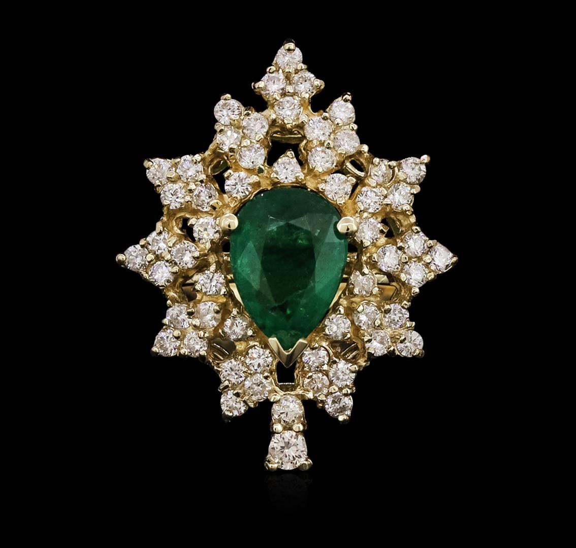 One electronically tested 14KT yellow gold ladies cast emerald and diamond ring with a bright polish finish. Identified with markings of "14K". Condition is new. Containing: One prong set pear modified brilliant cut natural emerald, measuring 9.82 x 7.25 x 4.71mm, approximate weight of 1.82ct., clarity is heavily included, type III, medium, moderately strong, green color, (GIA G 5/4), cut is good. Fifty-Six prong set round brilliant cut diamonds, measuring 2.10 - 1.50 x 1.08mm (depth est.) approximate total weight of 56 Stones = 0.68ct. Clarity: SI-1 to SI-2. Color: J - K, Cut is Good. Colored gemstones are presumed to have been subjected to commonly used enhancement processes. All diamonds and colored gemstones are graded in the mounting, unless otherwise stated. Total Weight of Colored Stones 1.82ct. Total Weight of Diamonds 0.68ct. Total Weight of Ring 7.40 grams. GGL Appraised at $4,630.00.