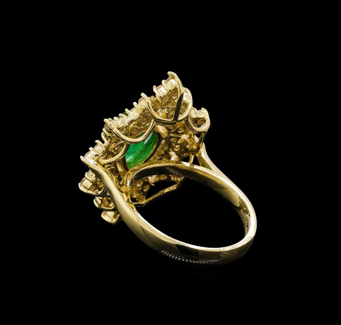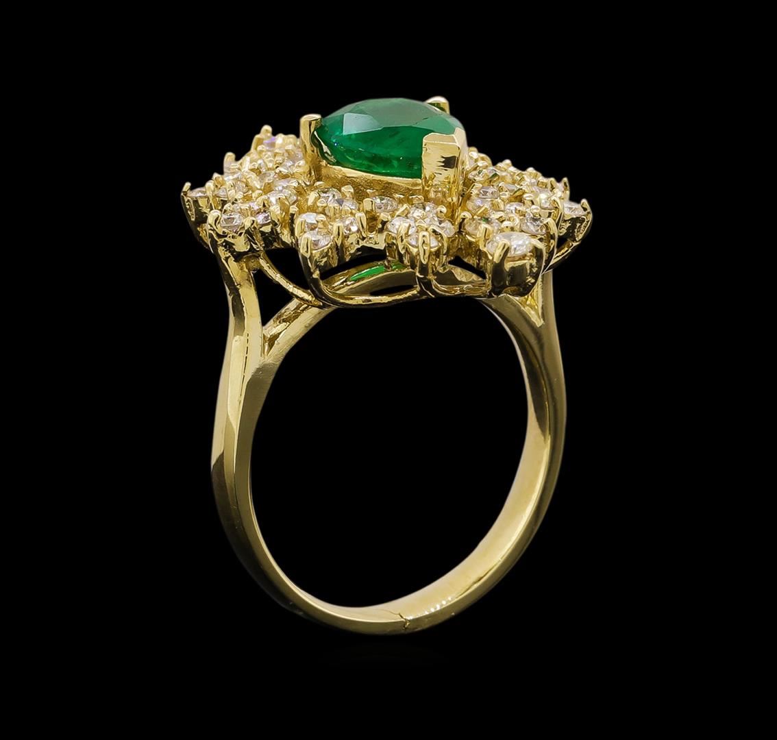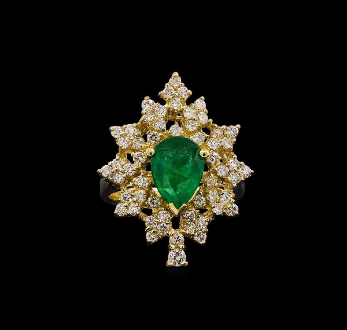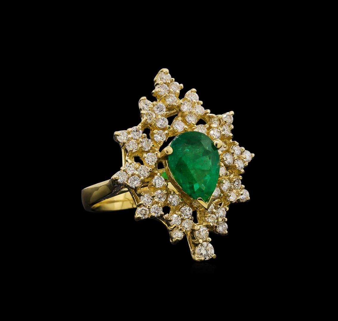 One electronically tested 14KT yellow gold ladies cast emerald and diamond ring with a bright polish finish. Identified with markings of "14K". Condition is new. Containing: One prong set pear modified brilliant cut natural emerald, measuring 9.82 x 7.25 x 4.71mm, approximate weight of 1.82ct., clarity is heavily included, type III, medium, moderately strong, green color, (GIA G 5/4), cut is good. Fifty-Six prong set round brilliant cut diamonds, measuring 2.10 - 1.50 x 1.08mm (depth est.) approximate total weight of 56 Stones = 0.68ct. Clarity: SI-1 to SI-2. Color: J - K, Cut is Good. Colored gemstones are presumed to have been subjected to commonly used enhancement processes. All diamonds and colored gemstones are graded in the mounting, unless otherwise stated. Total Weight of Colored Stones 1.82ct. Total Weight of Diamonds 0.68ct. Total Weight of Ring 7.40 grams. GGL Appraised at $4,630.00.