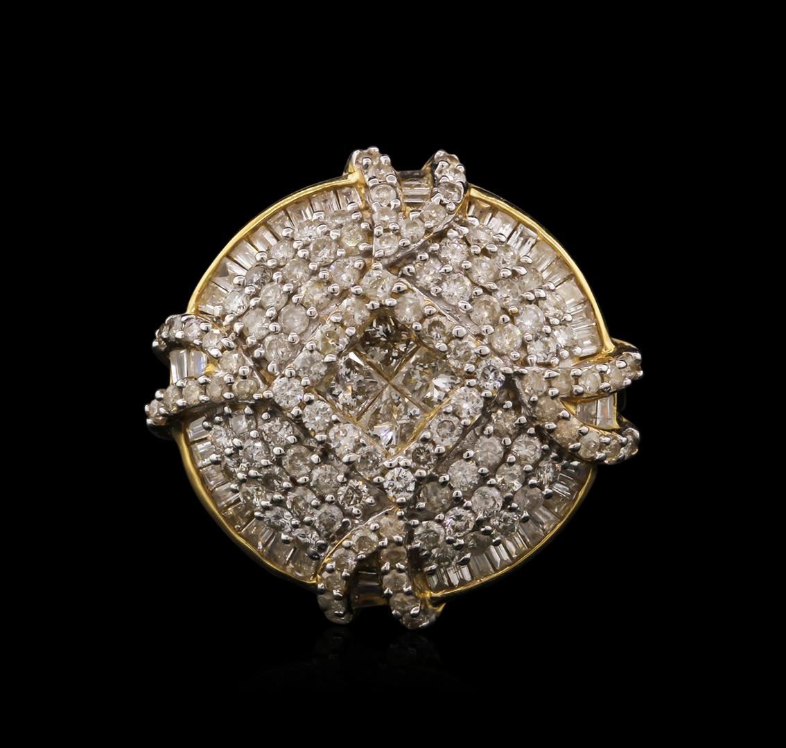 One electronically tested 14KT yellow gold ladies cast diamond ring with a bright polish finish. Identified with markings of "14K". Condition is new. Containing: Forty-Two channel set baguette cut diamonds, measuring 1.50 x 1.20 x 1.02mm (depth est.) approximate total weight of 42 Stones = 0.48ct. Clarity: SI-2. Color: I - J, Cut is Good. Four invisible set princess cut diamonds, measuring 2.40 x 2.40 x 1.80mm (depth est.) approximate total weight of 4 Stones = 0.32ct. Clarity: I-1. Color: H - I, Cut is Good. One Hundred Twelve prong set round brilliant cut diamonds, measuring 1.10 - 1.10 x 0.66mm (depth est.) approximate total weight of 112 Stones = 1.04ct. Clarity: I-1 to I-2. Color: I - J, Cut is Good. Diamonds are graded in the mounting, unless otherwise stated. Total Weight of Diamonds 1.84ct. Total Weight of Ring 7.50 grams. GGL Appraised at $4,005.00.