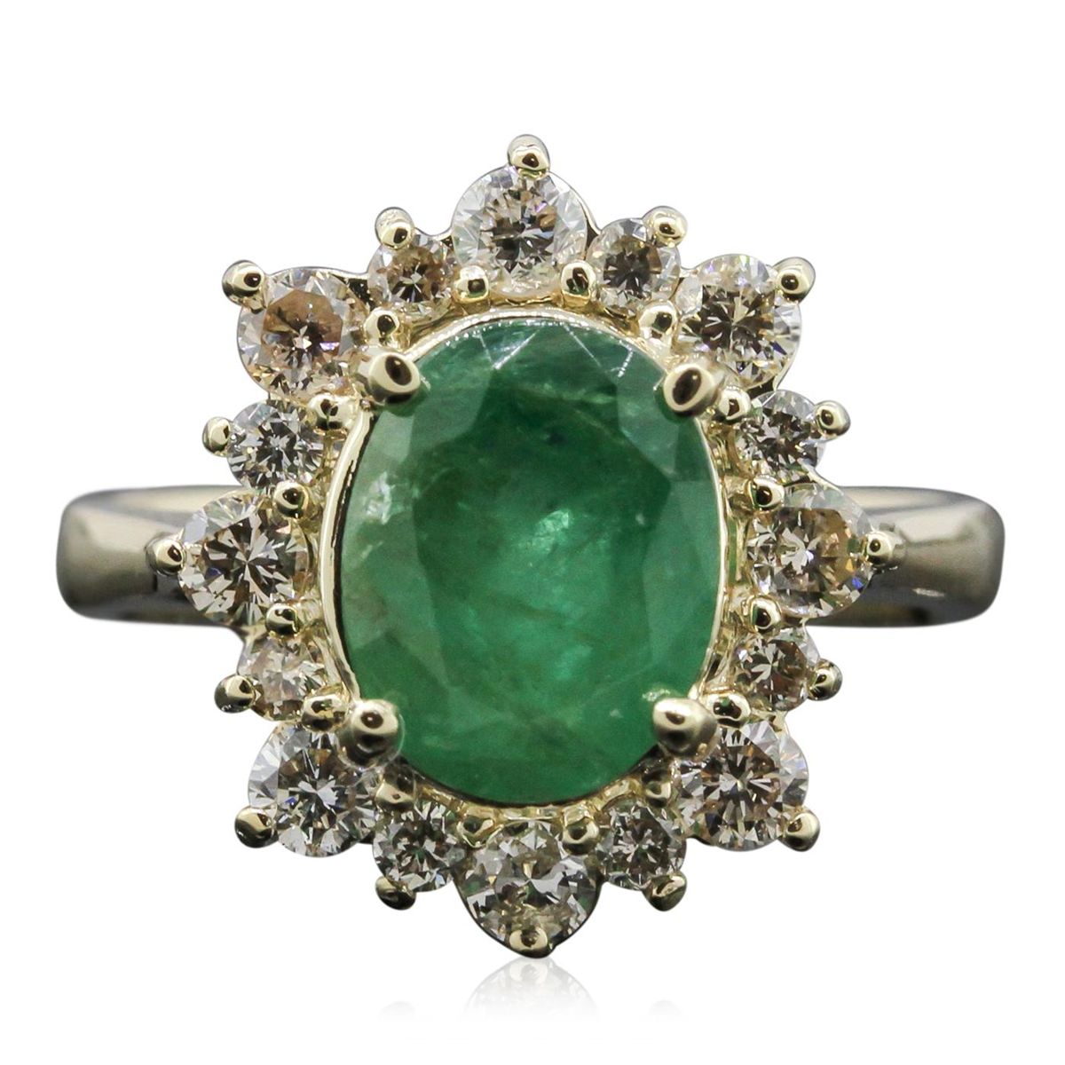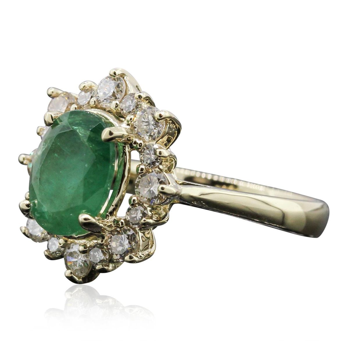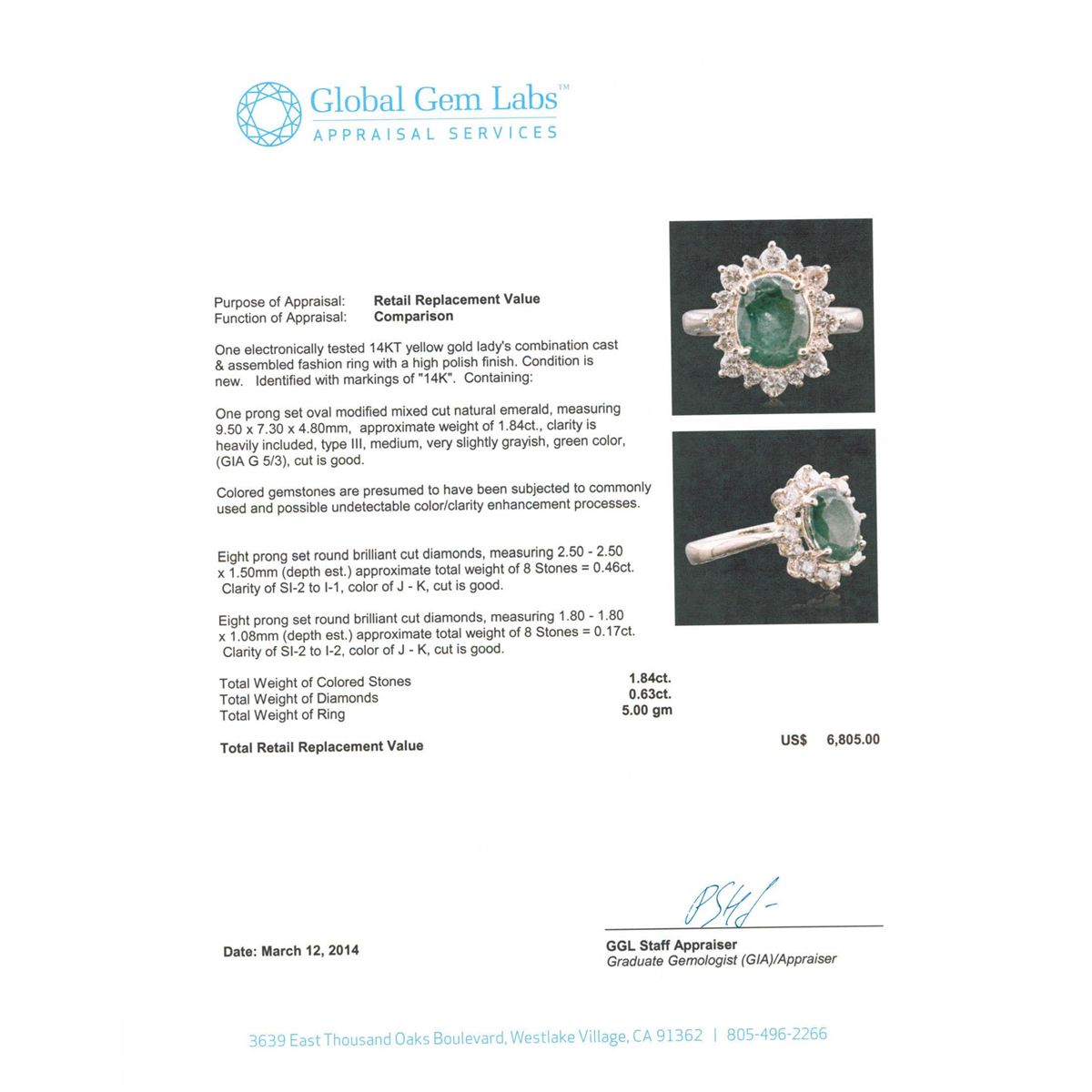 One electronically tested 14KT yellow gold Ladies combination cast & assembled fashion ring with a high polish finish. Condition is new. Identified with markings of "14K". Containing: One prong set oval modified mixed cut natural emerald, measuring 9.50 x 7.30 x 4.80mm, approximate weight of 1.84ct., clarity is heavily included, type III, medium, very slightly grayish, green color, (GIA G 5/3), cut is good. Colored gemstones are presumed to have been subjected to commonly used and possible undetectable color/clarity enhancement processes. Eight prong set round brilliant cut diamonds, measuring 2.50 - 2.50 x 1.50mm (depth est.) approximate total weight of 8 Stones = 0.46ct. Clarity of SI-2 to I-1, Color of J - K, Cut is Good. Eight prong set round brilliant cut diamonds, measuring 1.80 - 1.80 x 1.08mm (depth est.) approximate total weight of 8 Stones = 0.17ct. Clarity of SI-2 to I-2, Color of J - K, Cut is Good. Total Weight of Colored Stones 1.84ct. Total Weight of Diamonds 0.63ct. Total Weight of Ring 5.00 grams. GGL Appraised at $6,805.00.