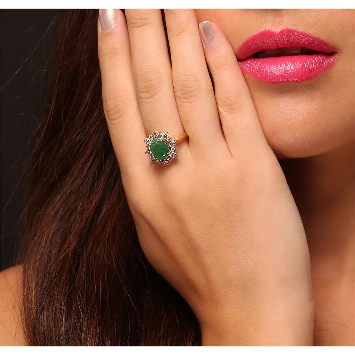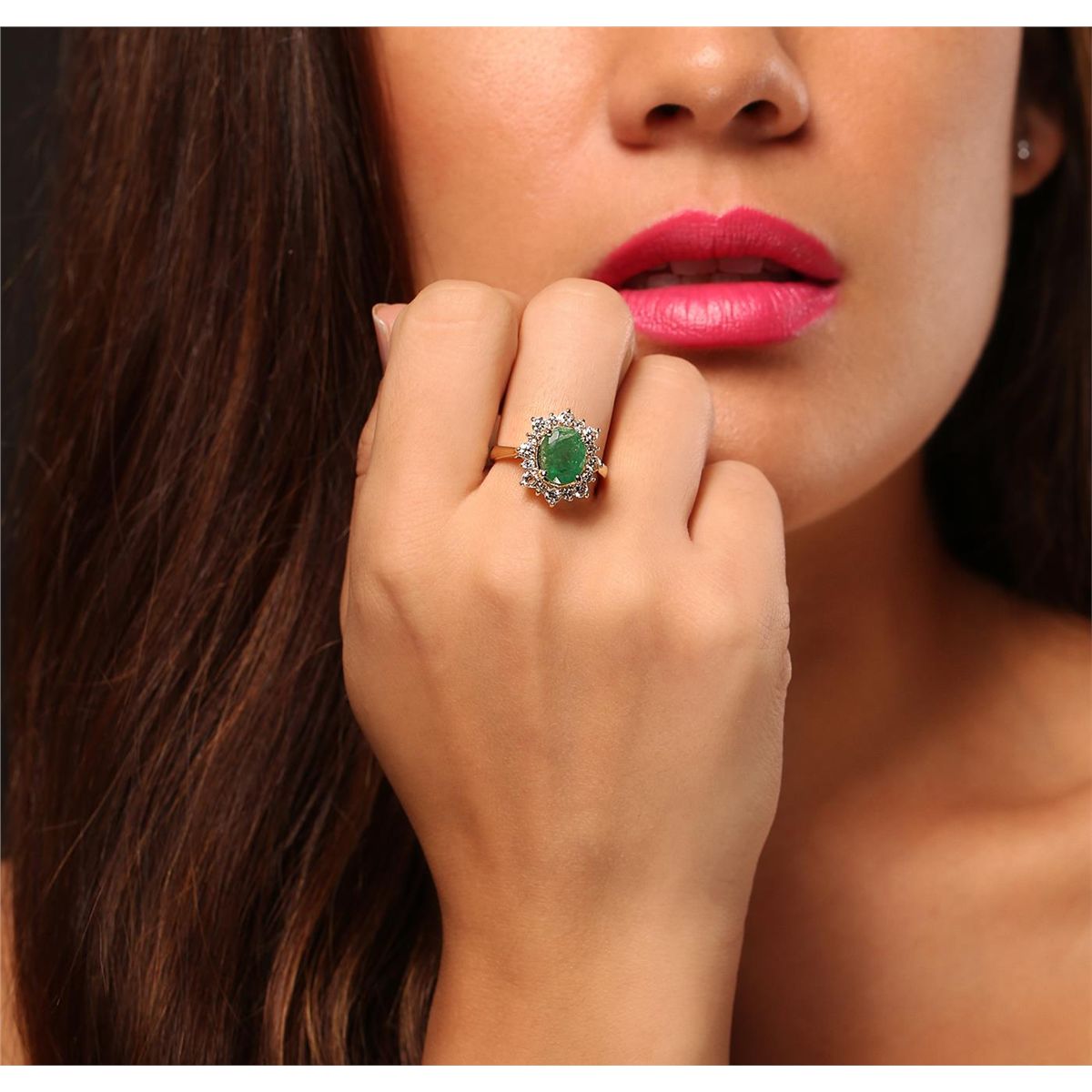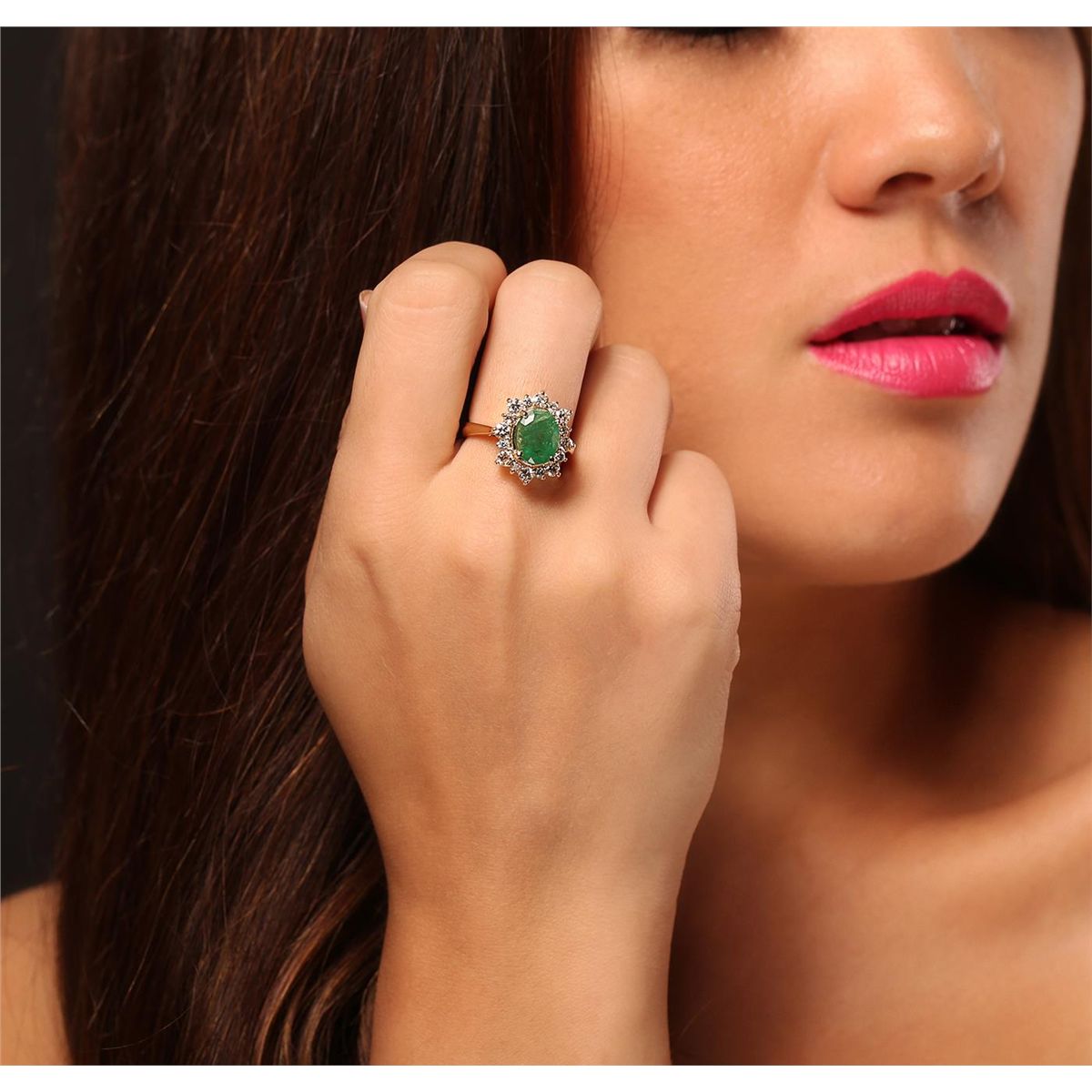 One electronically tested 14KT yellow gold Ladies combination cast & assembled fashion ring with a high polish finish. Condition is new. Identified with markings of "14K". Containing: One prong set oval modified mixed cut natural emerald, measuring 9.50 x 7.30 x 4.80mm, approximate weight of 1.84ct., clarity is heavily included, type III, medium, very slightly grayish, green color, (GIA G 5/3), cut is good. Colored gemstones are presumed to have been subjected to commonly used and possible undetectable color/clarity enhancement processes. Eight prong set round brilliant cut diamonds, measuring 2.50 - 2.50 x 1.50mm (depth est.) approximate total weight of 8 Stones = 0.46ct. Clarity of SI-2 to I-1, Color of J - K, Cut is Good. Eight prong set round brilliant cut diamonds, measuring 1.80 - 1.80 x 1.08mm (depth est.) approximate total weight of 8 Stones = 0.17ct. Clarity of SI-2 to I-2, Color of J - K, Cut is Good. Total Weight of Colored Stones 1.84ct. Total Weight of Diamonds 0.63ct. Total Weight of Ring 5.00 grams. GGL Appraised at $6,805.00.