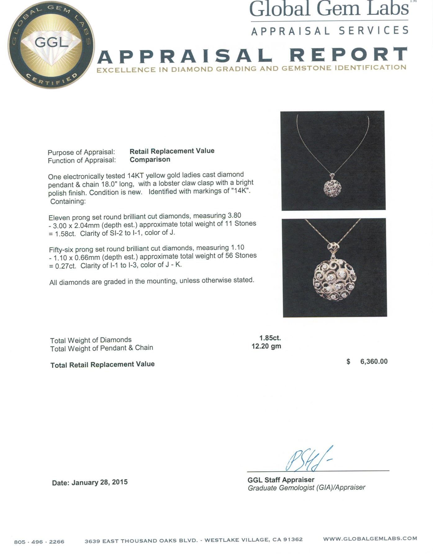 One electronically tested 14KT yellow gold ladies cast diamond pendant & chain 18.0" long, with a lobster claw clasp with a bright polish finish. Identified with markings of "14K". Condition is new. Containing: Eleven prong set round brilliant cut diamonds, measuring 3.80 - 3.00 x 2.04mm (depth est.) approximate total weight of 11 Stones = 1.58ct. Clarity: SI-2 to I-1. Color: J. Fifty-Six prong set round brilliant cut diamonds, measuring 1.10 - 1.10 x 0.66mm (depth est.) approximate total weight of 56 Stones = 0.27ct. Clarity: I-1 to I-3. Color: J - K. All diamonds are graded in the mounting, unless otherwise stated. Total Weight of Diamonds 1.85ct. Total Weight of Pendant & Chain 12.20 grams. GGL Appraised.