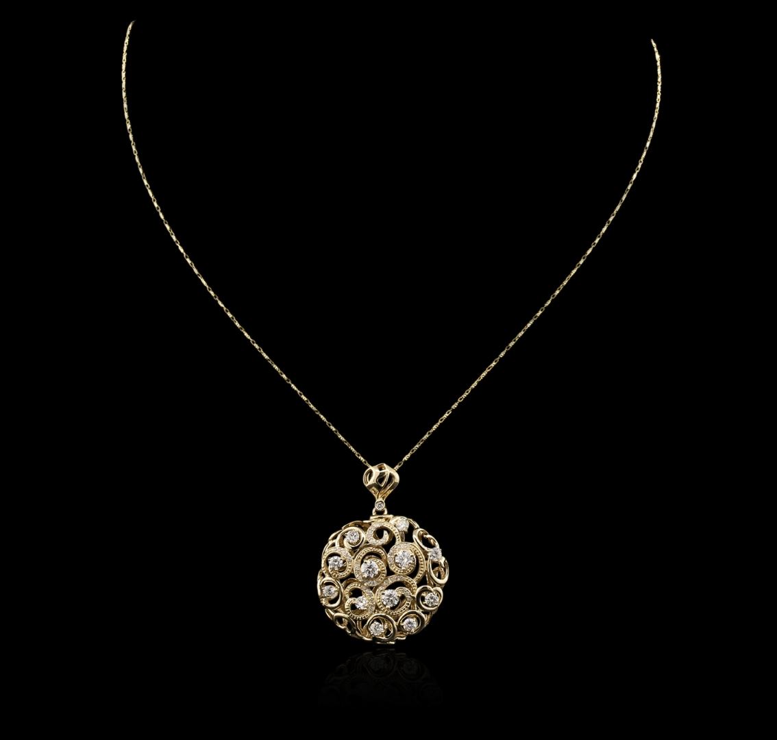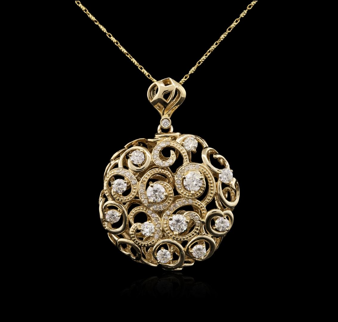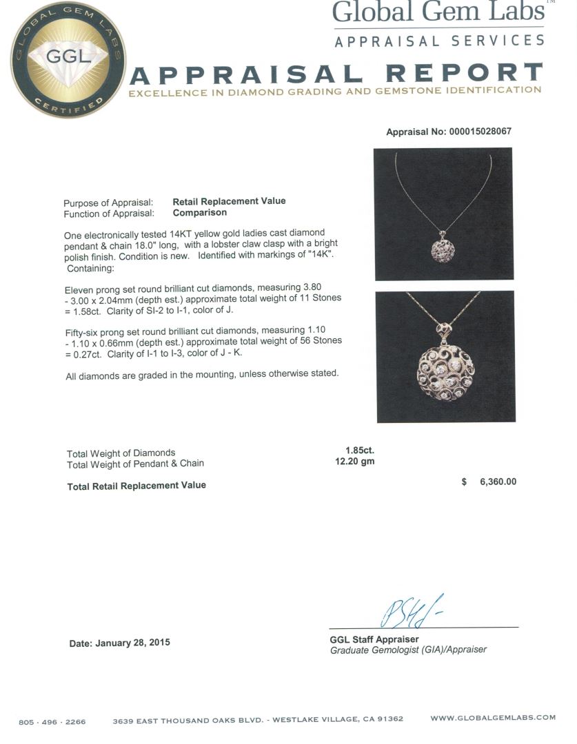 One electronically tested 14KT yellow gold ladies cast diamond pendant & chain 18.0" long, with a lobster claw clasp with a bright polish finish. Identified with markings of "14K". Condition is new. Containing: Eleven prong set round brilliant cut diamonds, measuring 3.80 - 3.00 x 2.04mm (depth est.) approximate total weight of 11 Stones = 1.58ct. Clarity: SI-2 to I-1. Color: J. Fifty-Six prong set round brilliant cut diamonds, measuring 1.10 - 1.10 x 0.66mm (depth est.) approximate total weight of 56 Stones = 0.27ct. Clarity: I-1 to I-3. Color: J - K. All diamonds are graded in the mounting, unless otherwise stated. Total Weight of Diamonds 1.85ct. Total Weight of Pendant & Chain 12.20 grams. GGL Appraised at $6,360.00.