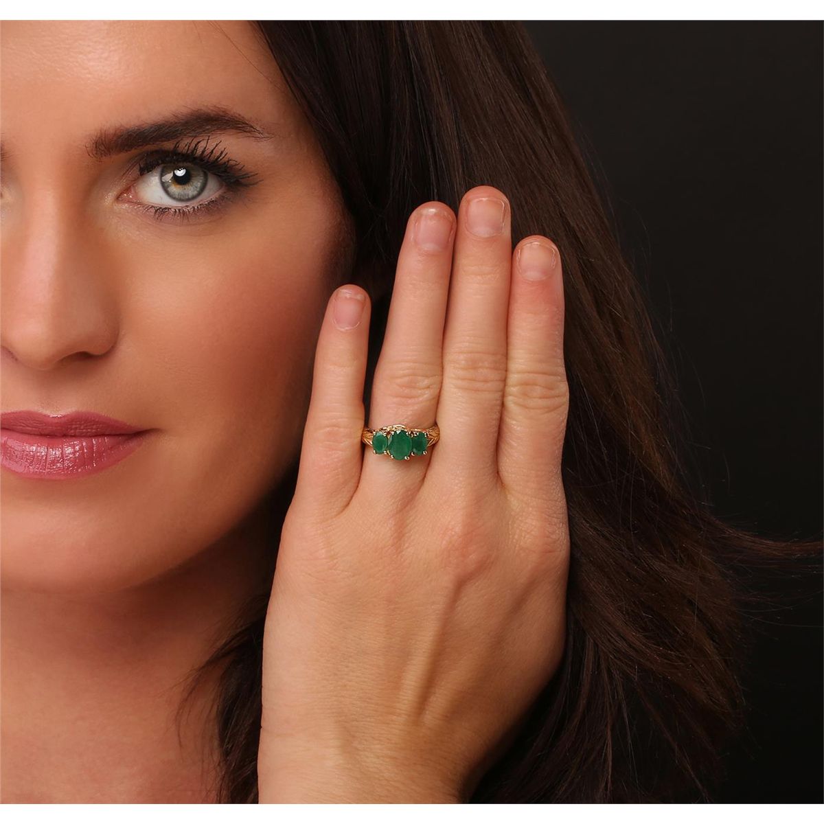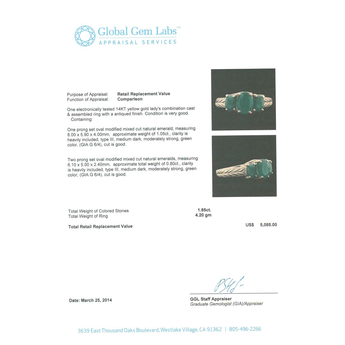 One electronically tested 14KT yellow gold Ladies combination cast & assembled ring with a antiqued finish. Condition is very good. Containing: One prong set oval modified mixed cut natural emerald, measuring 8.00 x 5.90 x 4.00mm, approximate weight of 1.05ct., clarity is heavily included, type III, medium dark, moderately strong, green color, (GIA G 6/4), cut is good. Two prong set oval modified mixed cut natural emeralds, measuring 6.10 x 5.00 x 2.40mm, approximate. Total Weight of 0.80ct., clarity is heavily included, type III, medium dark, moderately strong, green color, (GIA G 6/4), cut is good. Total Weight of Colored Stones 1.85ct. Total Weight of Ring 4.20gm. GGL Appraised at $5,085.00.